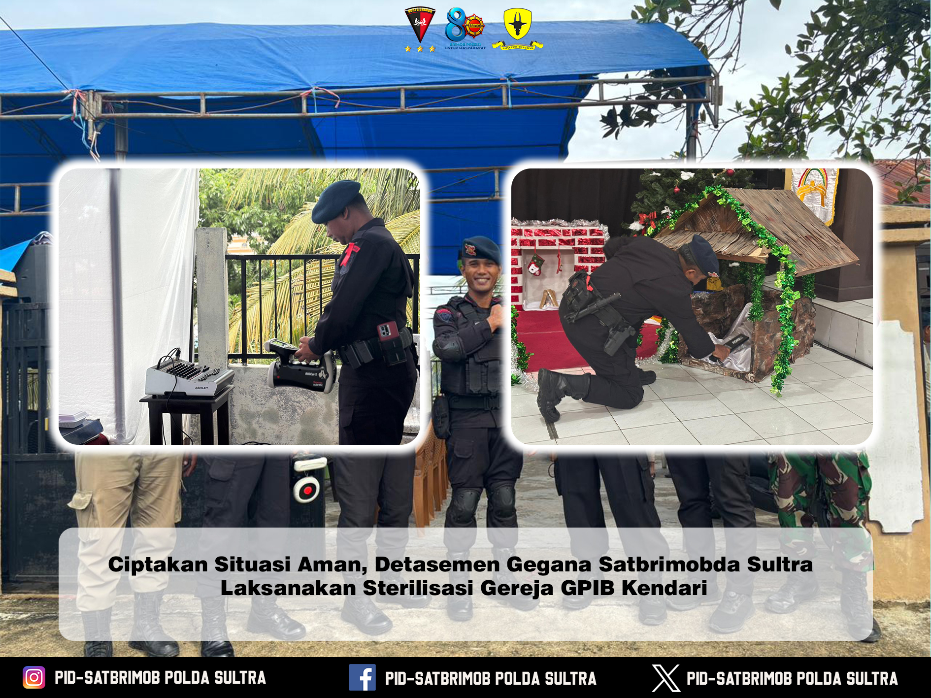 Kendari – Personel Detasemen Gegana Satuan Brimob Polda Sulawesi Tenggara melaksanakan kegiatan sterilisasi di Gereja Protestan di Indonesia Bagian Barat (GPIB) Kendari, sebagai upaya menciptakan situasi kamtibmas yang aman, tertib, dan kondusif bagi umat Kristiani dalam menjalankan ibadah.