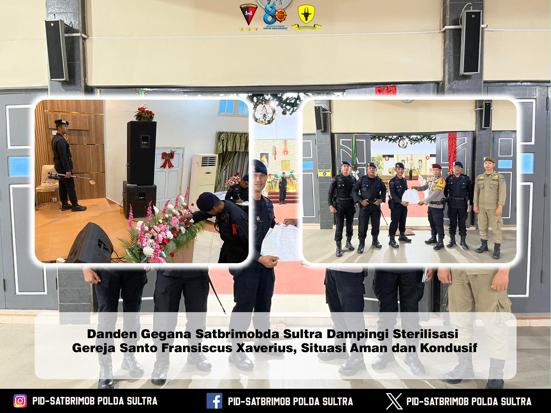 Detasemen Gegana Satuan Brimob Polda Sulawesi Tenggara melaksanakan kegiatan sterilisasi Komposit II Gegana di Gereja Santo Fransiscus Xaverius, sebagai bagian dari upaya menjamin keamanan dan ketertiban jalannya kegiatan ibadah umat Kristiani.
