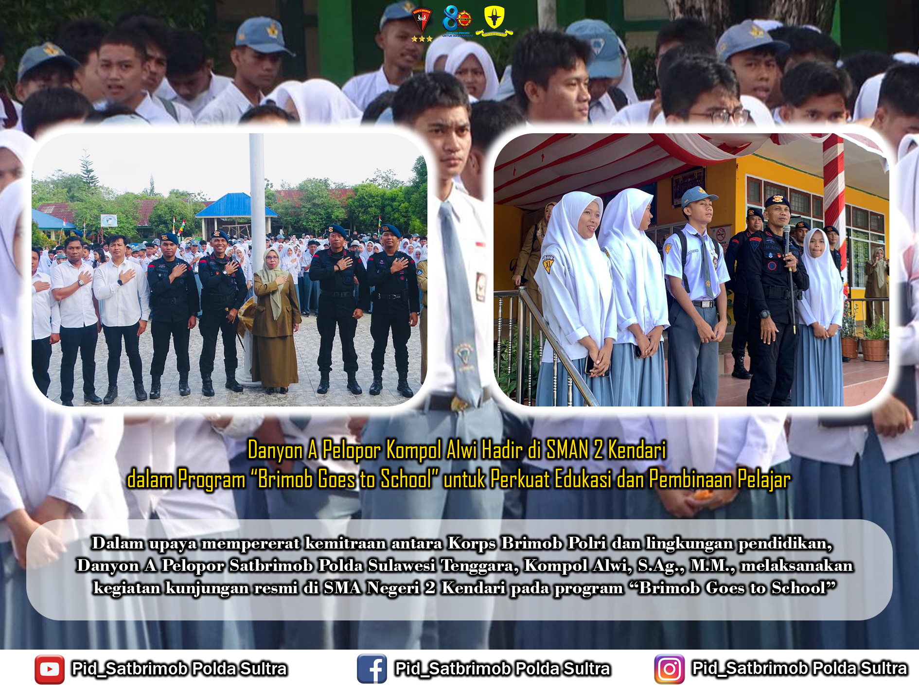 Kendari — Dalam upaya mempererat kemitraan antara Korps Brimob Polri dan lingkungan pendidikan, Danyon A Pelopor Satbrimob Polda Sulawesi Tenggara, Kompol Alwi, S.Ag., M.M., melaksanakan kegiatan kunjungan resmi di SMA Negeri 2 Kendari pada program “Brimob Goes to School”,