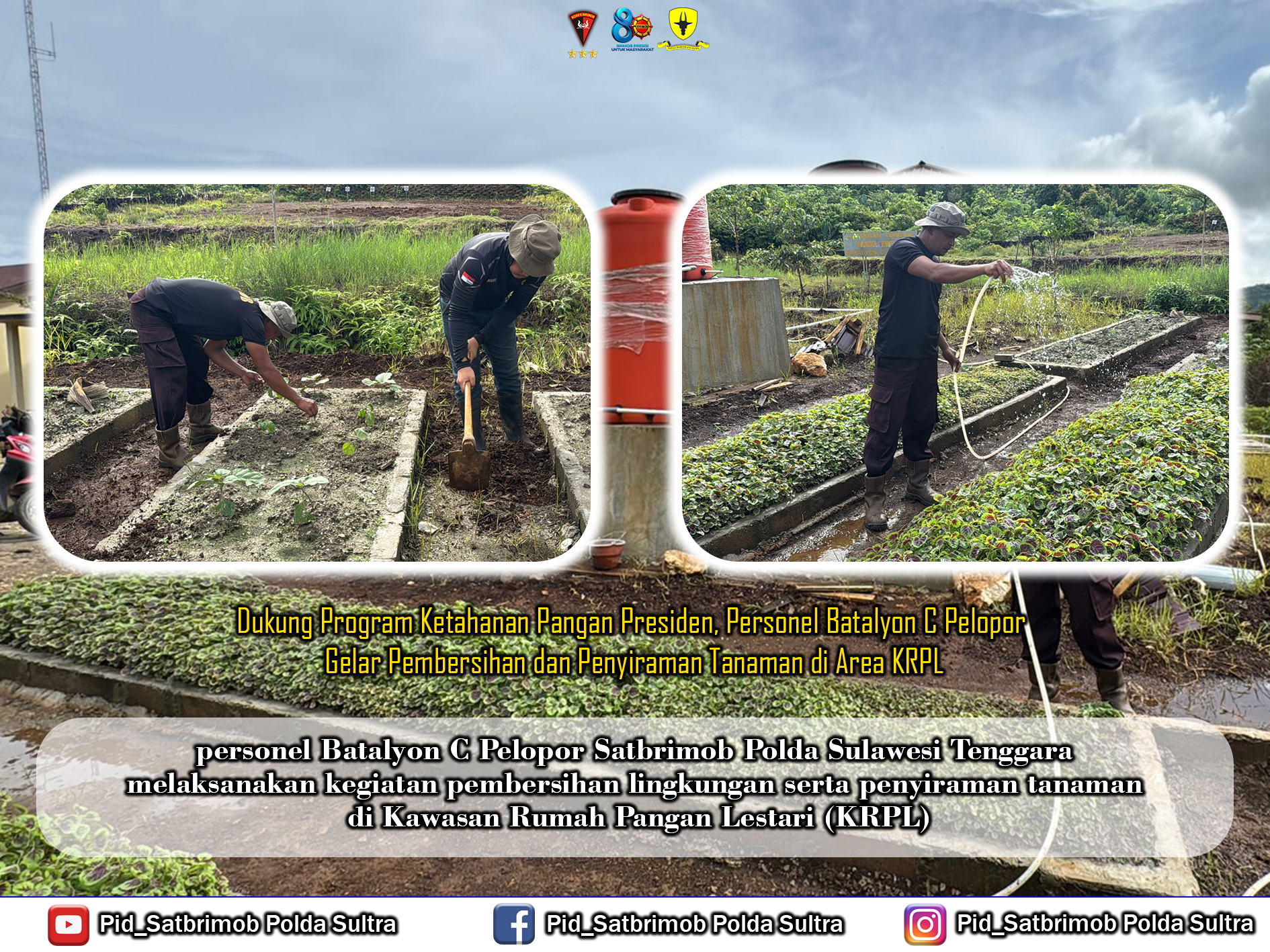 Dalam rangka mendukung Program Ketahanan Pangan yang dicanangkan Presiden Republik Indonesia, personel Batalyon C Pelopor Satbrimob Polda Sulawesi Tenggara melaksanakan kegiatan pembersihan lingkungan serta penyiraman tanaman di Kawasan Rumah Pangan Lestari (KRPL),