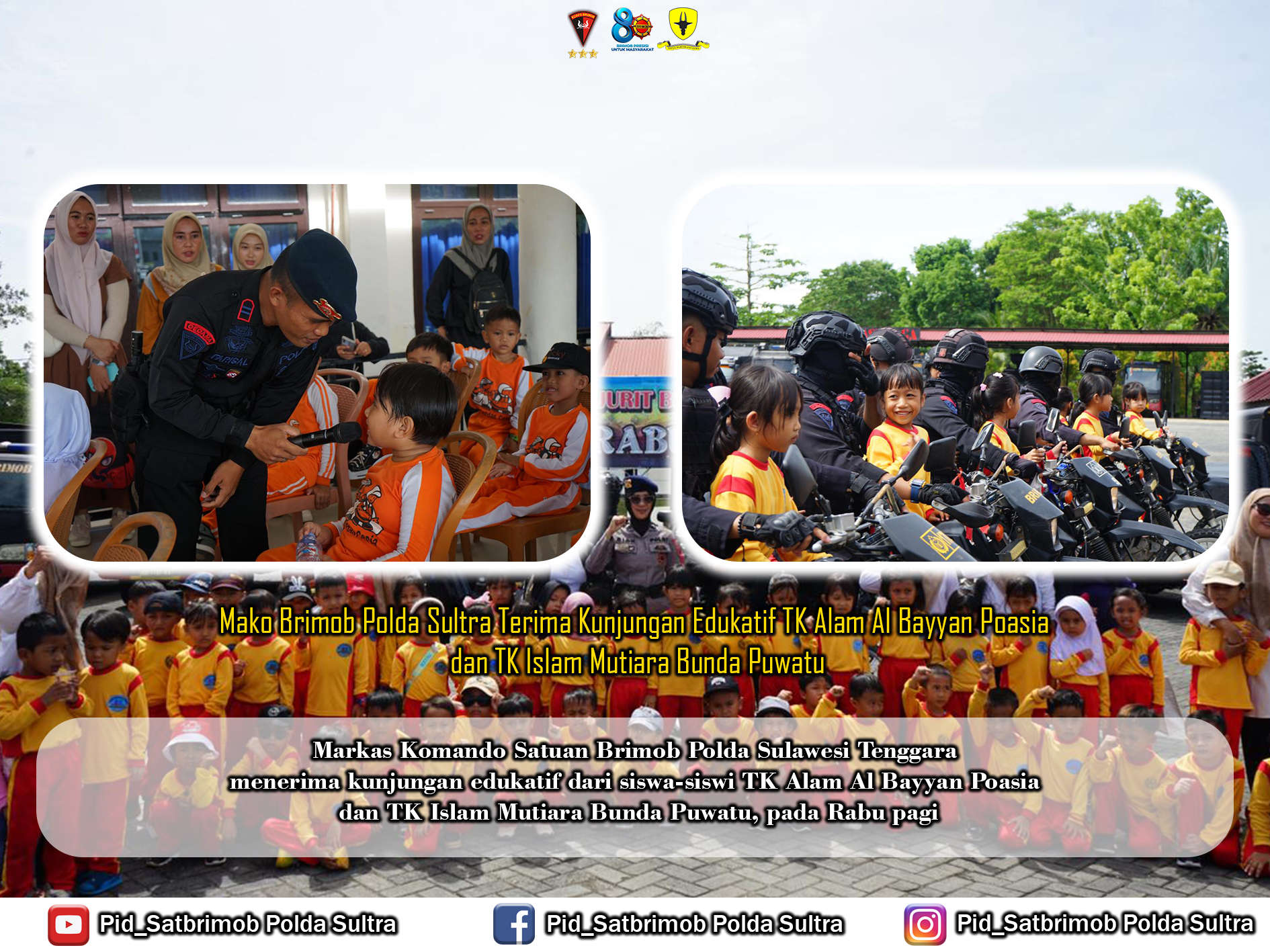 Kendari — Markas Komando Satuan Brimob Polda Sulawesi Tenggara menerima kunjungan edukatif dari siswa-siswi TK Alam Al Bayyan Poasia dan TK Islam Mutiara Bunda Puwatu, pada Rabu pagi. Kegiatan ini merupakan bagian dari program pengenalan profesi sejak usia dini serta upaya menanamkan wawasan kedisiplinan, keberanian, dan cinta tanah air kepada anak-anak.