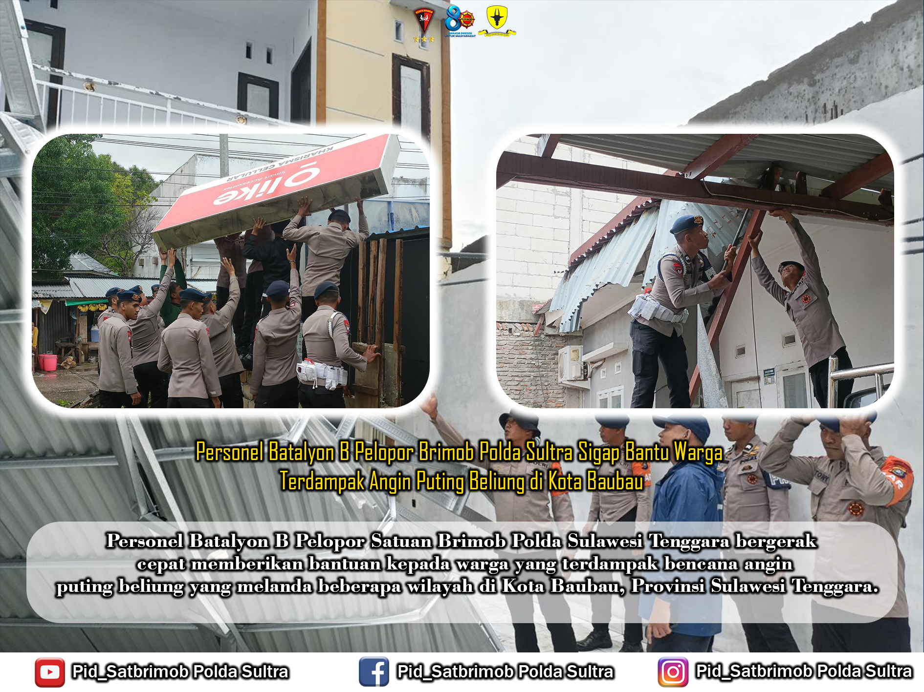BauBau – Personel Batalyon B Pelopor Satuan Brimob Polda Sulawesi Tenggara bergerak cepat memberikan bantuan kepada warga yang terdampak bencana angin puting beliung yang melanda beberapa wilayah di Kota Baubau, Provinsi Sulawesi Tenggara. Peristiwa alam yang terjadi secara tiba-tiba tersebut menyebabkan sejumlah rumah warga mengalami kerusakan, mulai dari atap yang beterbangan hingga bangunan yang roboh akibat terpaan angin kencang.