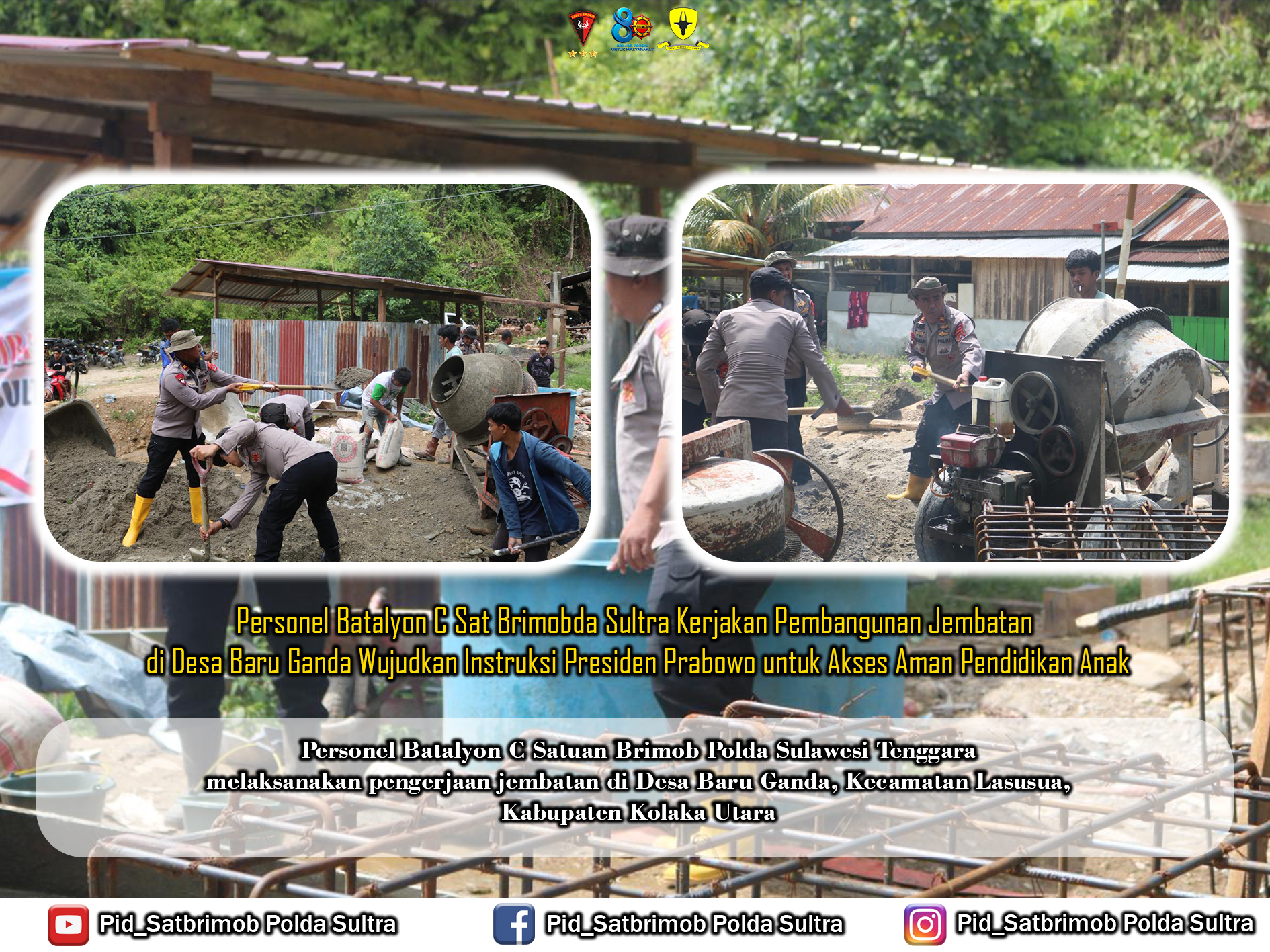Lasusua, Kolaka Utara — Personel Batalyon C Satuan Brimob Polda Sulawesi Tenggara melaksanakan pengerjaan jembatan di Desa Baru Ganda, Kecamatan Lasusua, Kabupaten Kolaka Utara. Kegiatan ini merupakan tindak lanjut dari instruksi Presiden Republik Indonesia, Prabowo Subianto, yang menempatkan pembangunan 300 ribu jembatan sebagai program prioritas nasional demi meningkatkan keselamatan masyarakat serta memperluas akses pendidikan bagi anak-anak di seluruh Indonesia.