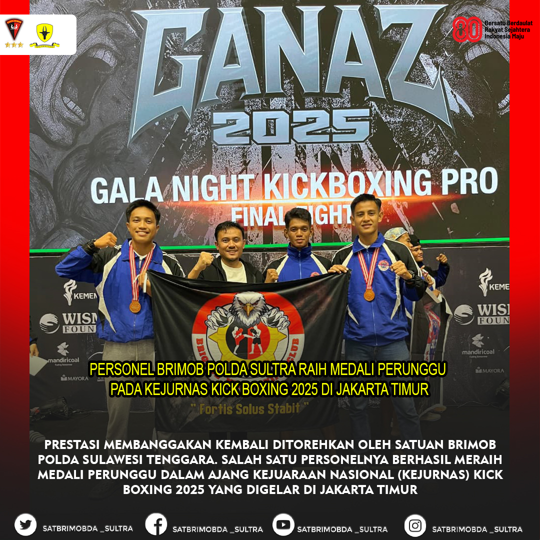 Jakarta Timur – Prestasi membanggakan kembali ditorehkan oleh Satuan Brimob Polda Sulawesi Tenggara. Salah satu personelnya berhasil meraih medali perunggu dalam ajang Kejuaraan Nasional (Kejurnas) Kick Boxing 2025 yang digelar di Jakarta Timur. Keberhasilan ini menjadi bukti nyata bahwa personel Brimob tidak hanya unggul dalam tugas operasional, tetapi juga memiliki kemampuan dan dedikasi tinggi di bidang olahraga.