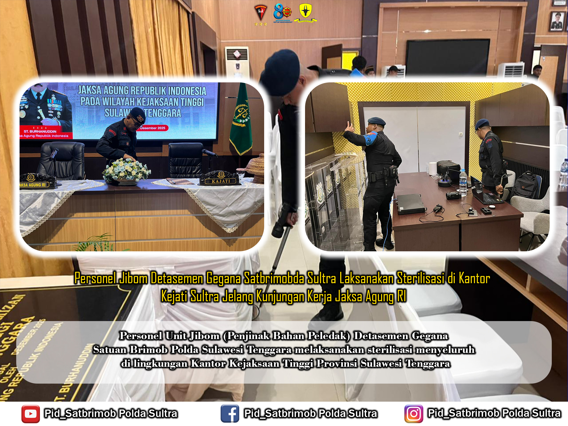 Kendari – Personel Unit Jibom (Penjinak Bahan Peledak) Detasemen Gegana Satuan Brimob Polda Sulawesi Tenggara melaksanakan sterilisasi menyeluruh di lingkungan Kantor Kejaksaan Tinggi Provinsi Sulawesi Tenggara. Kegiatan ini dilakukan sebagai langkah preventif dalam rangka memastikan keamanan dan kenyamanan menjelang kunjungan kerja Jaksa Agung Republik Indonesia di wilayah Sultra.