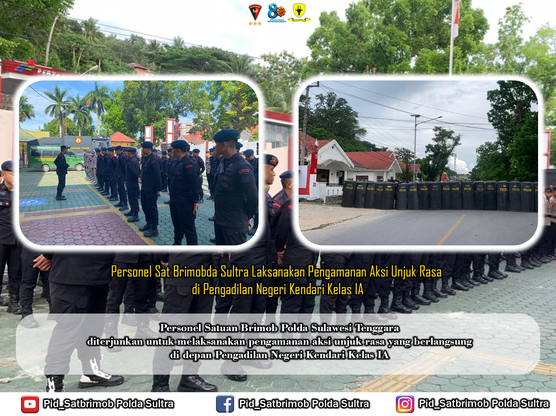 Aksi unjuk rasa yang digelar oleh massa aksi dari … (nama kelompok/ormas jika ada) tersebut berlangsung sejak pagi hari. Menyikapi hal tersebut, Komandan Satuan Brimob Polda Sultra Kombes Pol Dr. Sugianto Marweki, S.I.K., M.Si. memerintahkan penurunan personel dari Detasemen/ Batalyon … sebagai langkah preventif untuk mengantisipasi potensi gangguan kamtibmas serta memberikan rasa aman, baik kepada pengunjuk rasa, masyarakat sekitar, maupun aparat pengadilan yang sedang melaksanakan proses persidangan.