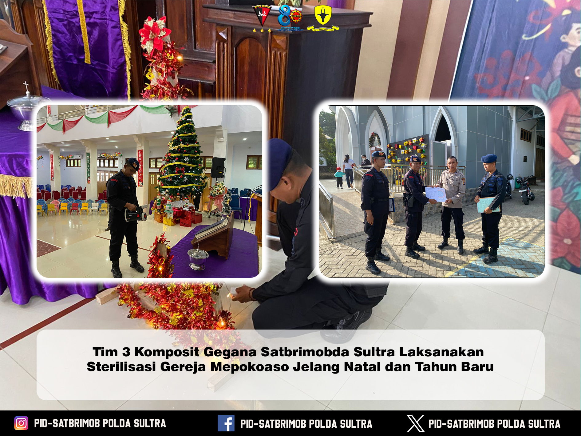 Kendari — Dalam rangka menjamin keamanan dan kenyamanan umat Kristiani dalam melaksanakan ibadah Natal serta menyambut perayaan Tahun Baru, Tim Komposit 3 Detasemen Gegana Satuan Brimob Polda Sulawesi Tenggara melaksanakan kegiatan sterilisasi di Gereja Mepokoaso, Kota Kendari, menjelang puncak perayaan Natal dan Tahun Baru.