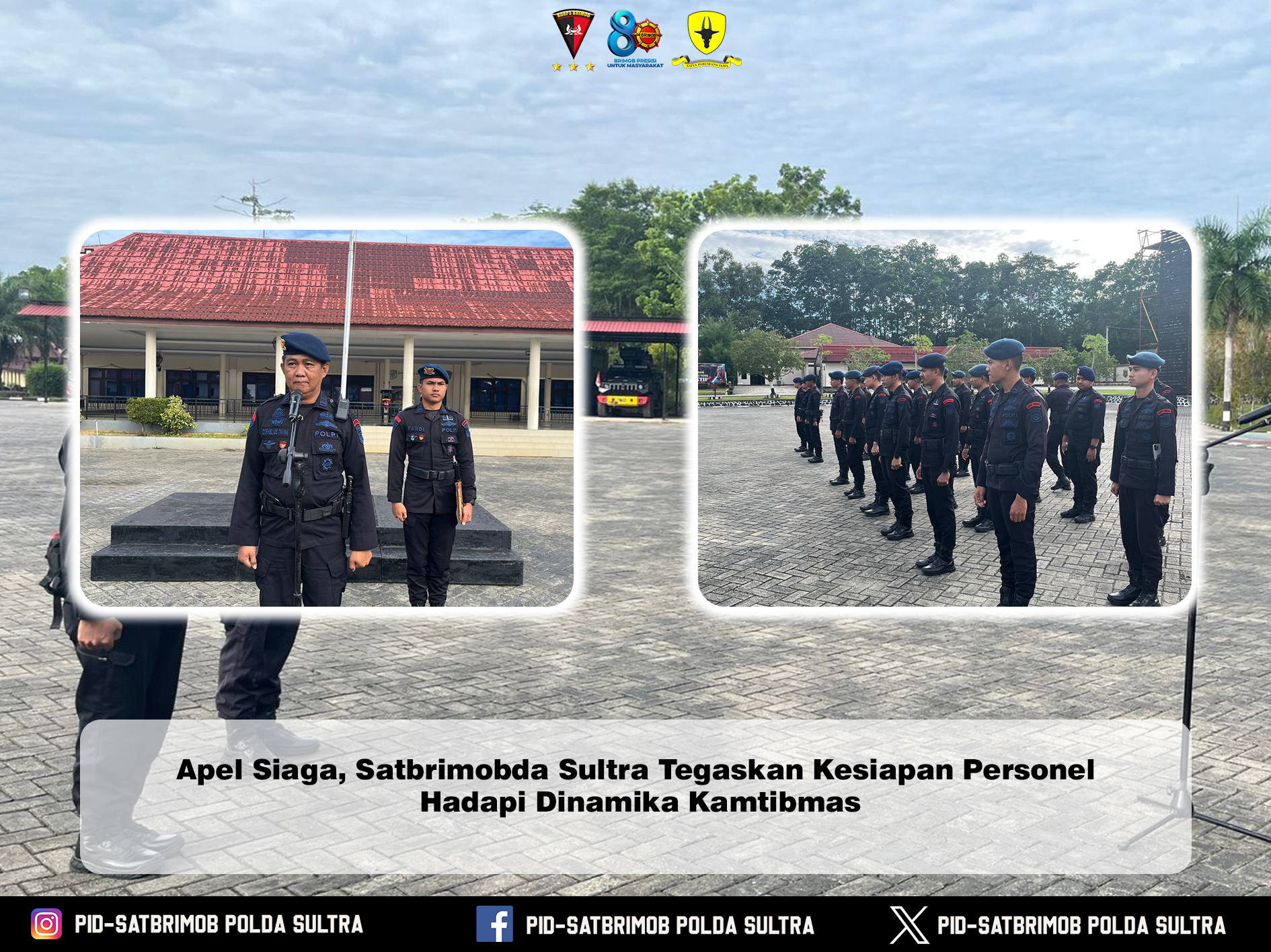 Satuan Brigade Mobil Daerah Sulawesi Tenggara (Satbrimobda Sultra) melaksanakan Apel Siaga Personel sebagai bentuk pengecekan kesiapan kekuatan, perlengkapan, serta soliditas personel dalam menghadapi berbagai potensi gangguan keamanan dan ketertiban masyarakat (kamtibmas) di wilayah hukum Polda Sulawesi Tenggara.