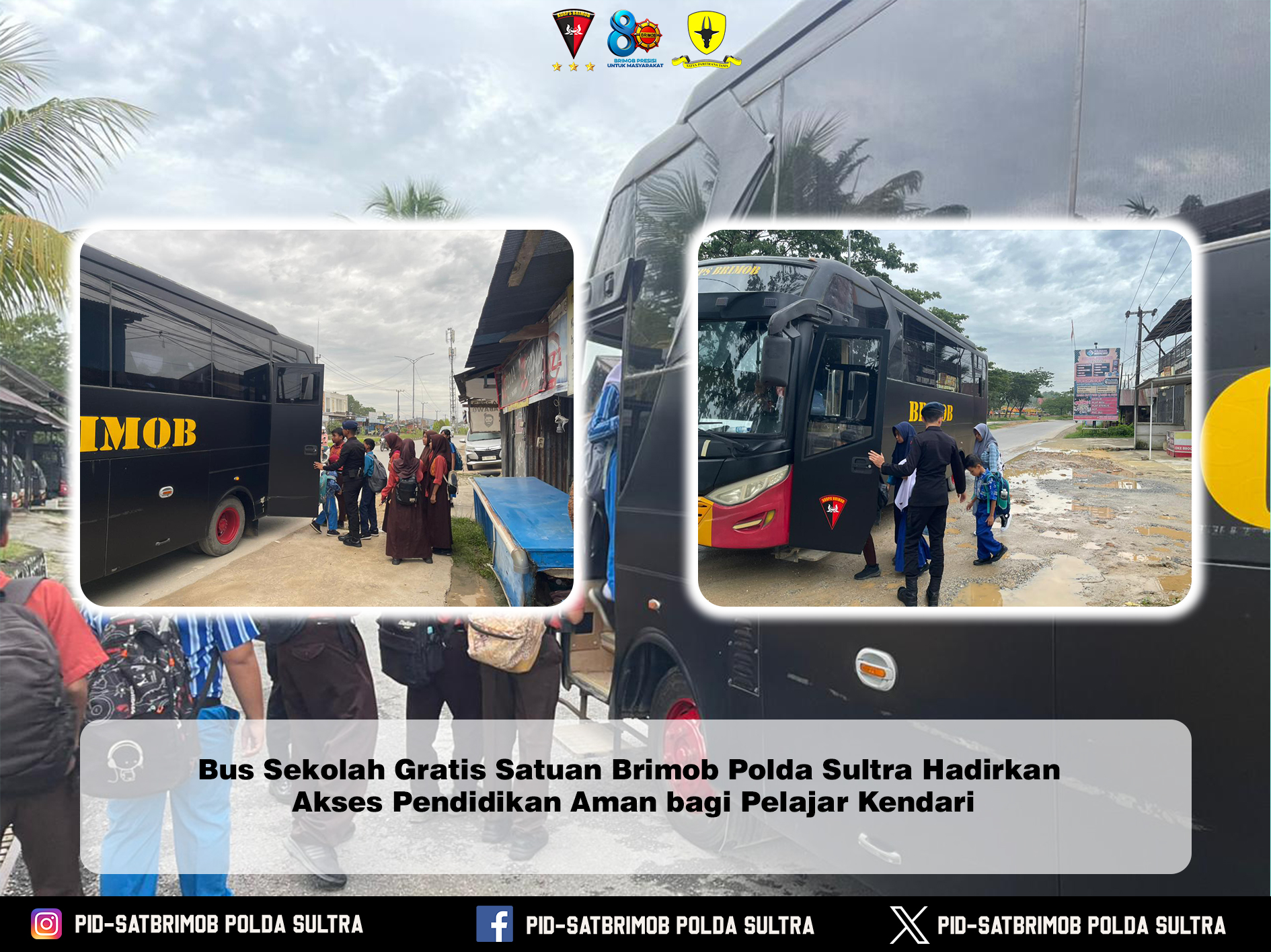 Satuan Brimob Polda Sulawesi Tenggara kembali menunjukkan komitmennya dalam mendukung dunia pendidikan melalui program Bus Sekolah Gratis, yang melayani pengantaran siswa-siswi sekolah di wilayah Kota Kendari. Program ini dilaksanakan sebagai bentuk kepedulian Polri terhadap keselamatan dan kenyamanan pelajar dalam menempuh perjalanan menuju dan dari sekolah.