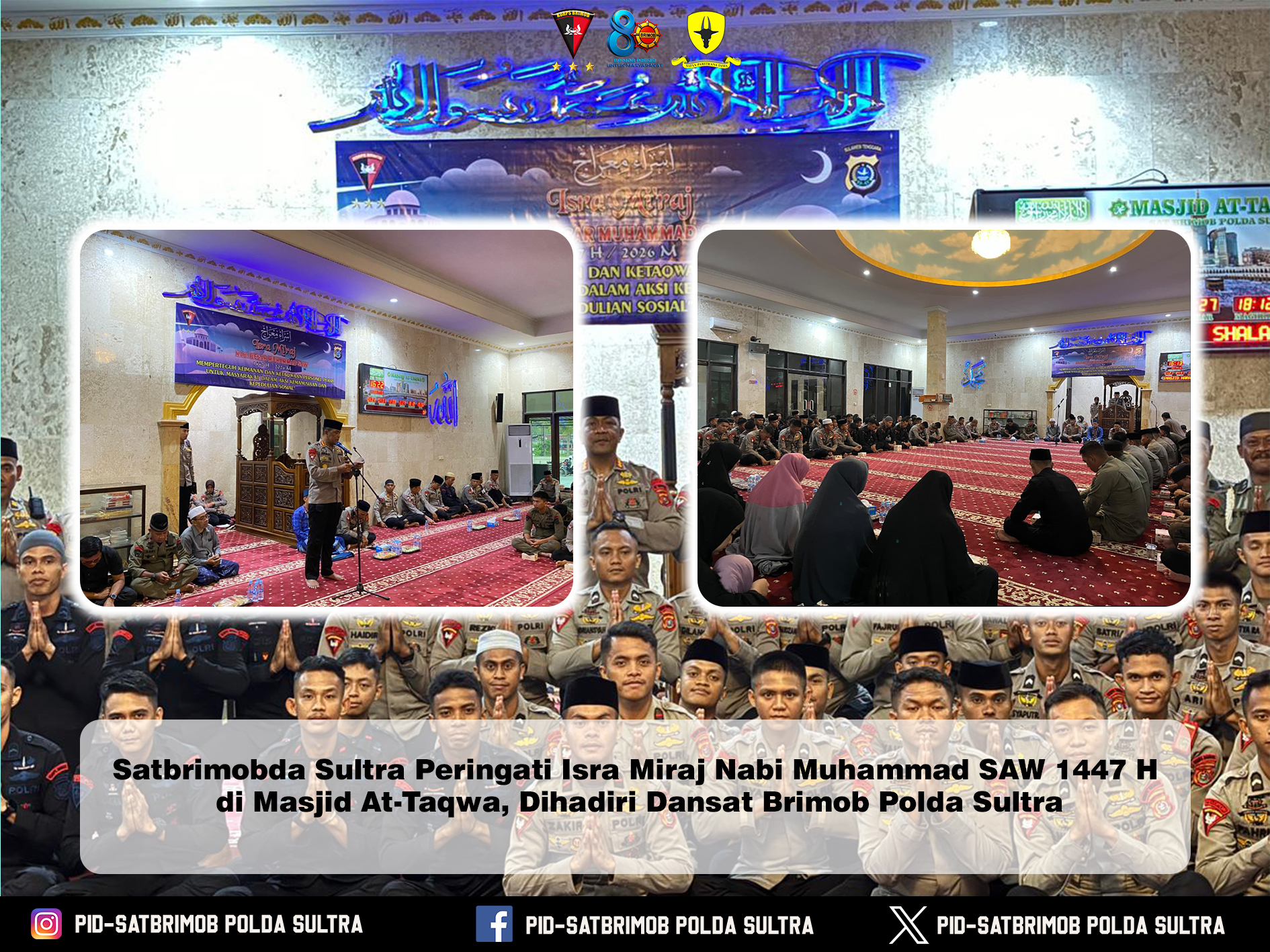 Satuan Brigade Mobil (Satbrimob) Polda Sulawesi Tenggara memperingati Isra Miraj Nabi Muhammad SAW 1447 Hijriah yang digelar khidmat di Masjid At-Taqwa Satbrimobda Sultra. Kegiatan keagamaan ini dihadiri langsung oleh Dansat Brimob Polda Sultra, Kombes Pol Agus Setiawan, S.I.K., beserta para pejabat utama, perwira, bintara, tamtama, dan ASN Satbrimobda Sultra.