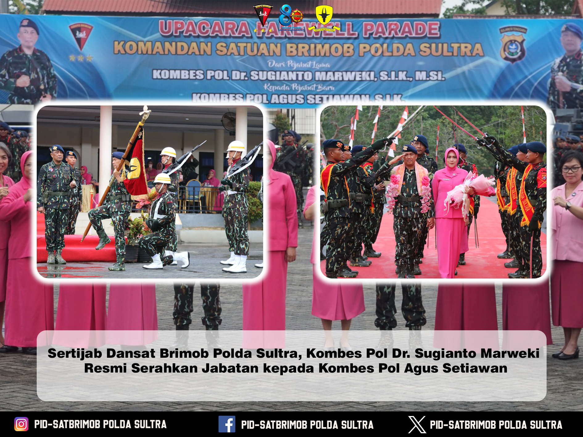 Rangkaian kegiatan sertijab tersebut dirangkaikan dengan penyerahan tunggu jabatan serta upacara pelepasan pejabat lama, sebagai bentuk penghormatan dan apresiasi atas dedikasi serta pengabdian Kombes Pol Dr. Sugianto Marweki selama menjabat sebagai Dansat Brimob Polda Sultra.