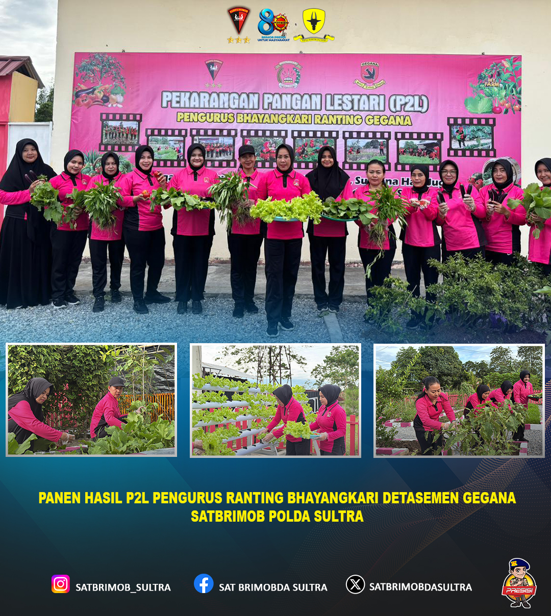 Pengurus Ranting Bhayangkari Detasemen Gegana Satuan Brimob Polda Sulawesi Tenggara melaksanakan kegiatan Panen Hasil Pekarangan Pangan Lestari (P2L) sebagai bentuk dukungan terhadap program ketahanan pangan keluarga. Kegiatan ini berlangsung dengan penuh semangat kebersamaan dan kepedulian terhadap pemanfaatan lahan pekarangan secara produktif.