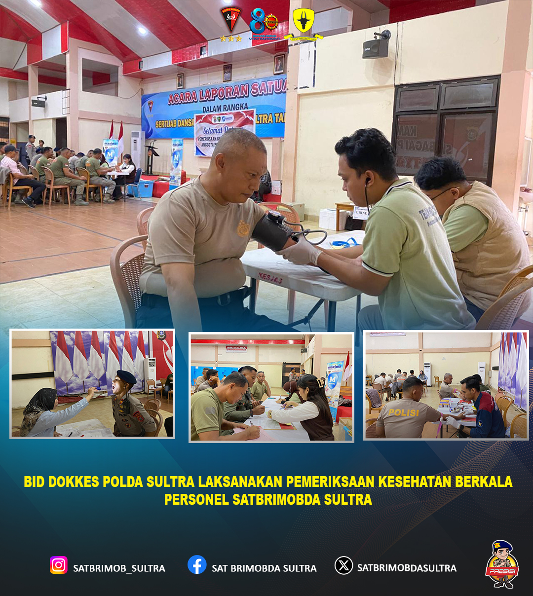 Kendari — Dalam rangka menjaga dan meningkatkan derajat kesehatan serta kesiapan fisik personel, Satuan Brigade Mobil Daerah (Satbrimobda) Sulawesi Tenggara melaksanakan pemeriksaan kesehatan berkala yang dilakukan oleh Bidang Kedokteran dan Kesehatan (Bid Dokkes) Polda Sultra. Kegiatan ini berlangsung di Aula Jananuraga Satbrimobda Sultra.