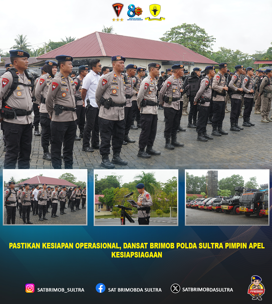 Kendari – Komandan Satuan Brimob Polda Sulawesi Tenggara, Kombes Pol Agus Setiawan, S.I.K., memimpin langsung apel kesiapsiagaan yang dilaksanakan di Mako Satbrimob Polda Sultra. Kegiatan ini bertujuan untuk memastikan kesiapan personel dan peralatan dalam menghadapi berbagai potensi gangguan kamtibmas maupun situasi kontinjensi lainnya.