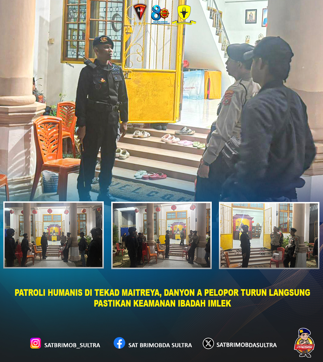 Personel Batalyon A Pelopor Satbrimob Polda Sultra melaksanakan kegiatan patroli dan pengamanan di Tekad Maitreya sebagai bentuk komitmen dalam menjaga situasi kamtibmas tetap aman dan kondusif, khususnya di lingkungan tempat ibadah.