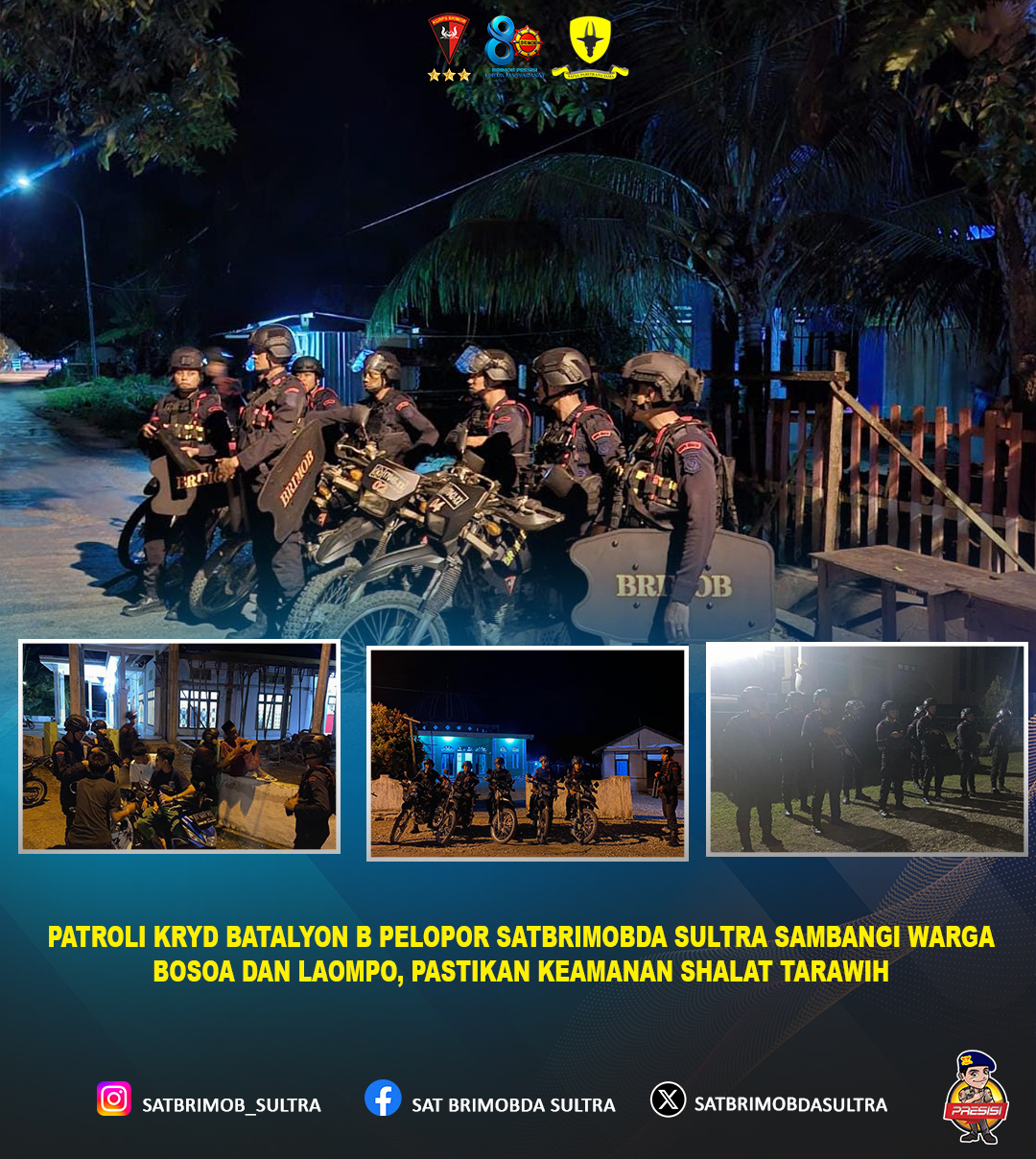Personel Patroli Kegiatan Rutin yang Ditingkatkan (KRYD) Batalyon B Pelopor Satuan Brimob Polda Sulawesi Tenggara (Satbrimobda Sultra) melaksanakan patroli dialogis di wilayah Kelurahan Bosoa dan Kelurahan Laompo dalam rangka menjaga situasi keamanan dan ketertiban masyarakat (kamtibmas), khususnya menjelang pelaksanaan ibadah Shalat Tarawih.
