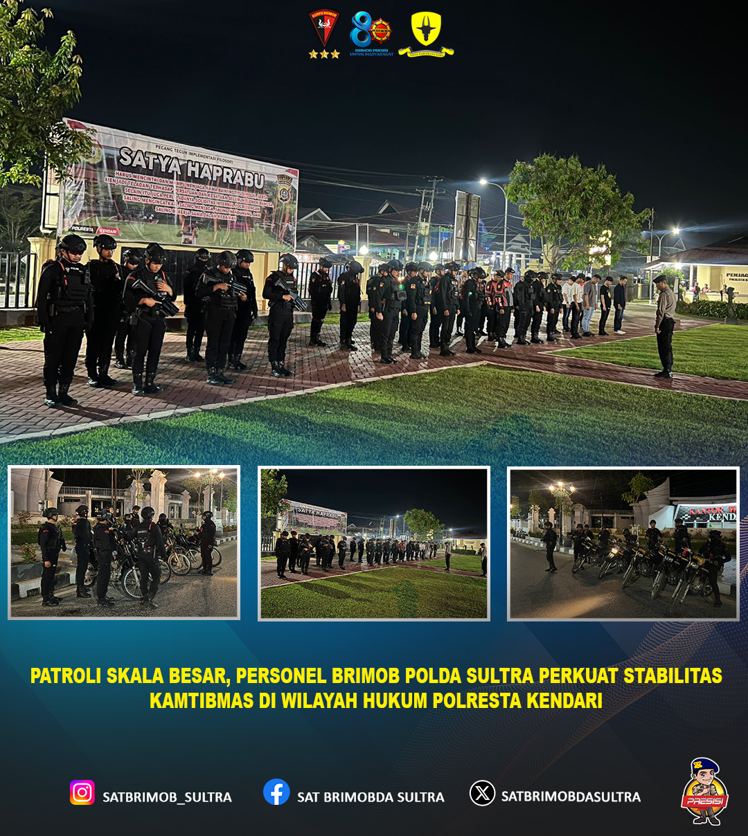 Dalam rangka menjaga situasi keamanan dan ketertiban masyarakat tetap kondusif, personel Brimob Polda Sultra melaksanakan giat patroli skala besar di wilayah hukum Polresta Kendari. Kegiatan ini dilakukan sebagai bentuk kesiapsiagaan dan respons cepat terhadap potensi gangguan kamtibmas di tengah masyarakat.