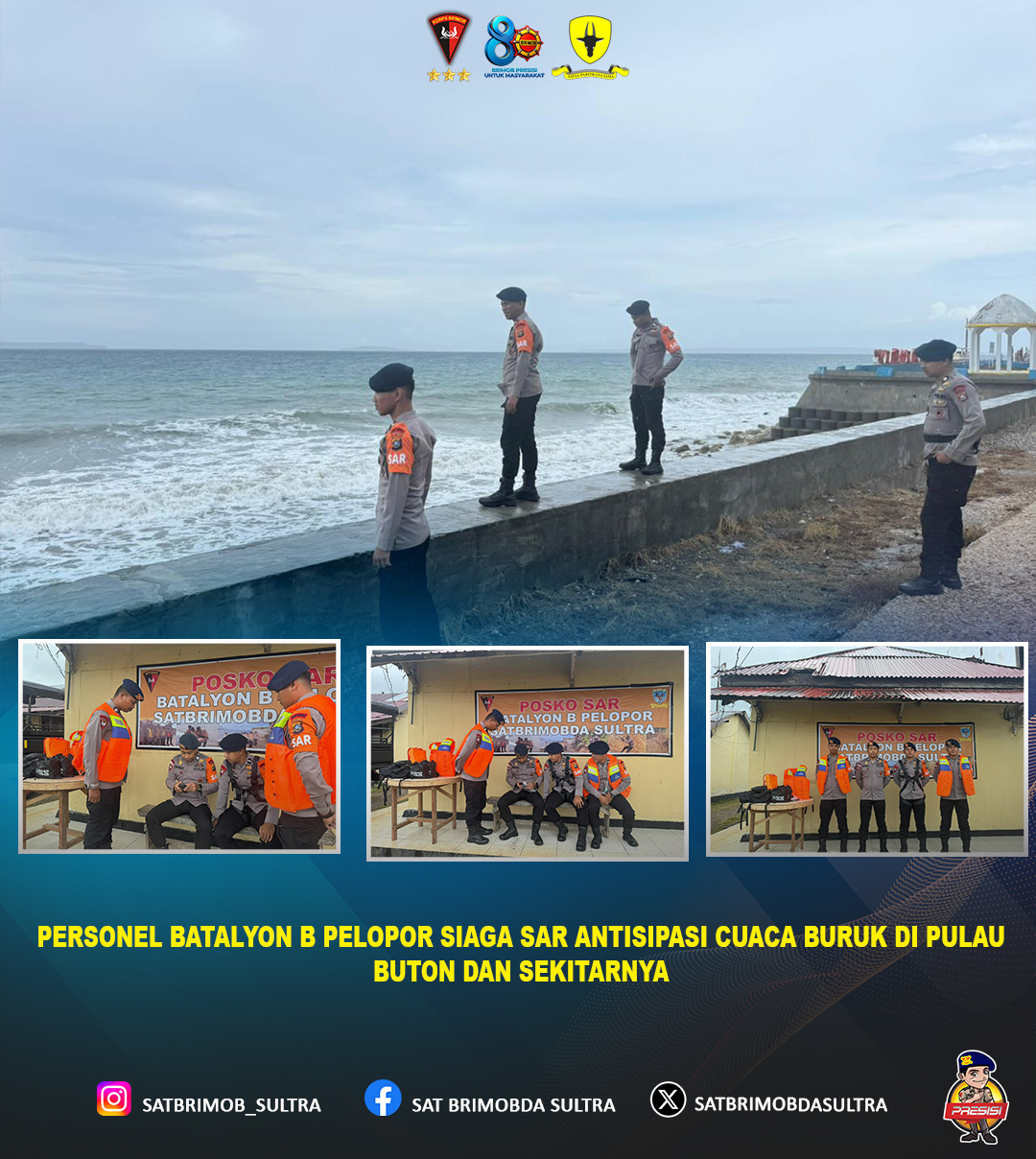 Dalam rangka mengantisipasi dampak cuaca buruk yang melanda wilayah Pulau Buton dan sekitarnya, personel Batalyon B Pelopor Satuan Brimob Polda Sulawesi Tenggara melaksanakan siaga Search and Rescue (SAR). Kesiapsiagaan ini merupakan bentuk komitmen Brimob dalam mendukung upaya penanggulangan bencana serta memberikan perlindungan dan pelayanan kepada masyarakat.
