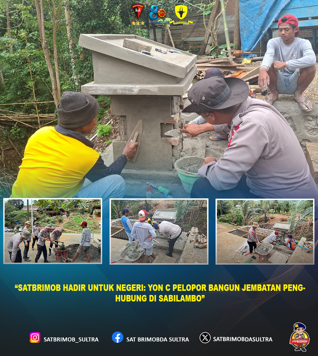 Personel Batalyon C Pelopor Totallang Sat Brimob Polda Sulawesi Tenggara melaksanakan kegiatan pembangunan jembatan di Kelurahan Sabilambo, Kecamatan Kolaka, Kabupaten Kolaka. Kegiatan ini merupakan bentuk pengabdian dan kepedulian Brimob dalam membantu meningkatkan akses dan mobilitas masyarakat setempat.