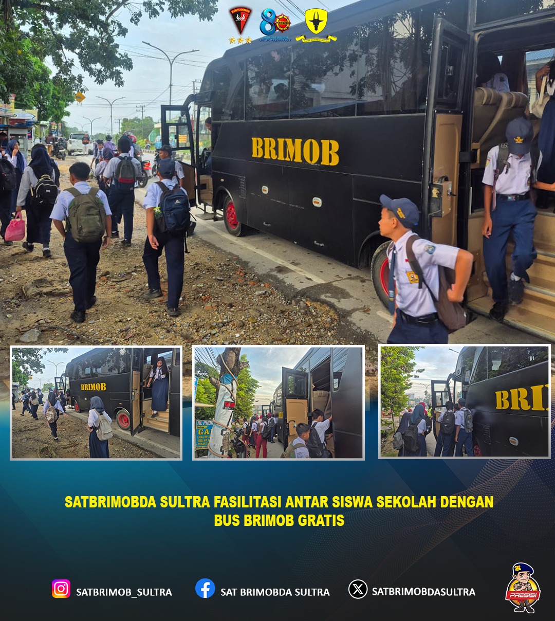 Personel Satuan Brimob Polda Sultra (Satbrimobda Sultra) melaksanakan kegiatan pengantaran siswa sekolah dengan menggunakan bus Brimob gratis sebagai bentuk pelayanan dan kepedulian terhadap masyarakat, khususnya para pelajar.