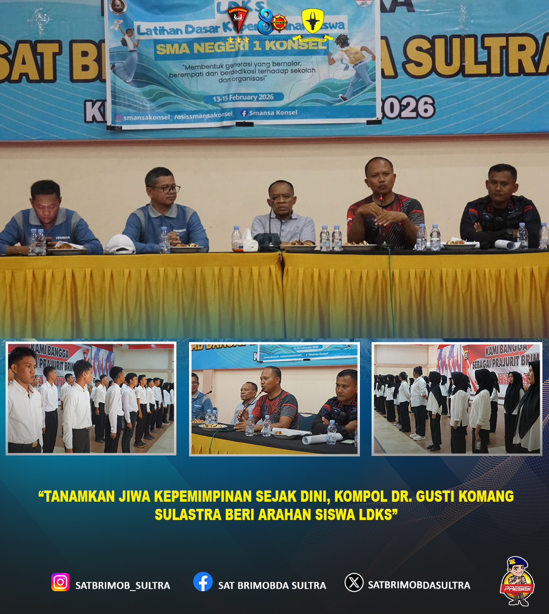 Kompol Dr. Gusti Komang Sulastra, S.H., M.H., memberikan arahan dan motivasi kepada para siswa peserta Latihan Dasar Kepemimpinan Siswa (LDKS) dari SMA Negeri 1 Konawe Selatan yang dilaksanakan di Aula Jananuraga. Kegiatan tersebut bertujuan membentuk karakter generasi muda yang disiplin, bertanggung jawab, dan memiliki jiwa kepemimpinan yang kuat.