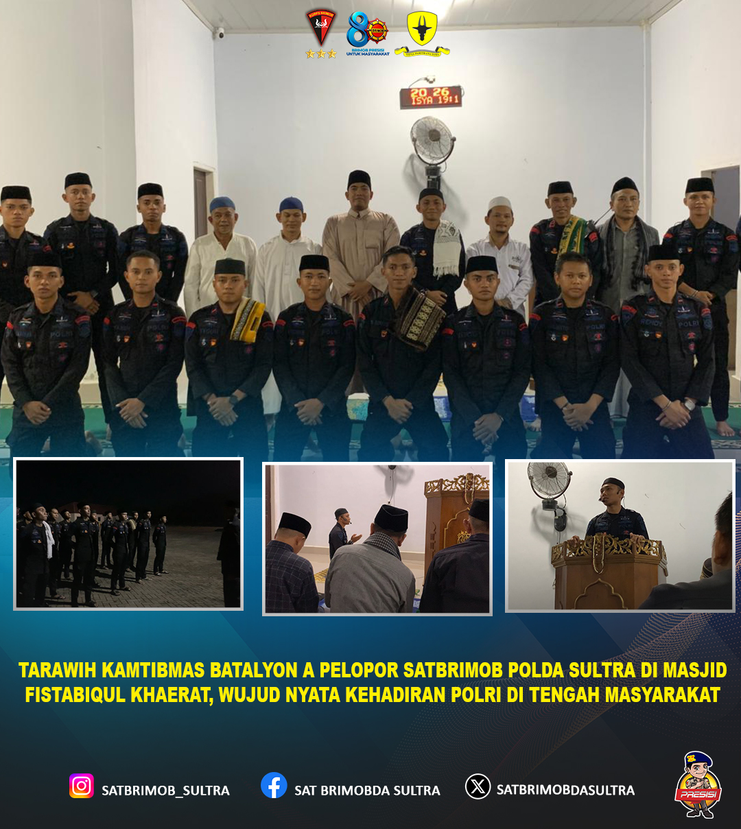 Dalam rangka menciptakan situasi keamanan dan ketertiban masyarakat (kamtibmas) yang kondusif selama bulan suci Ramadhan, personel Batalyon A Pelopor Satuan Brigade Mobil Kepolisian Daerah Sulawesi Tenggara (Satbrimob Polda Sultra) melaksanakan kegiatan Tarawih Kamtibmas di Masjid Fistabiqul Khaerat, Kecamatan Ranomeeto.
