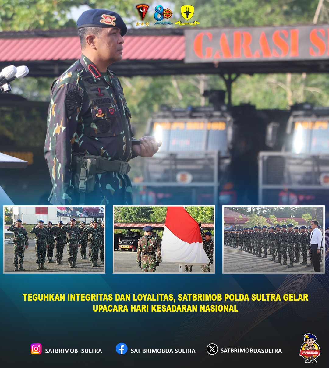 Kendari — Personel Satuan Brimob Polda Sulawesi Tenggara melaksanakan Upacara Hari Kesadaran Nasional yang berlangsung dengan khidmat di Mako Satbrimob Polda Sultra. Kegiatan tersebut dipimpin langsung oleh Dansat Brimob Polda Sultra, Kombes Pol Agus Setiawan, S.I.K., selaku inspektur upacara.