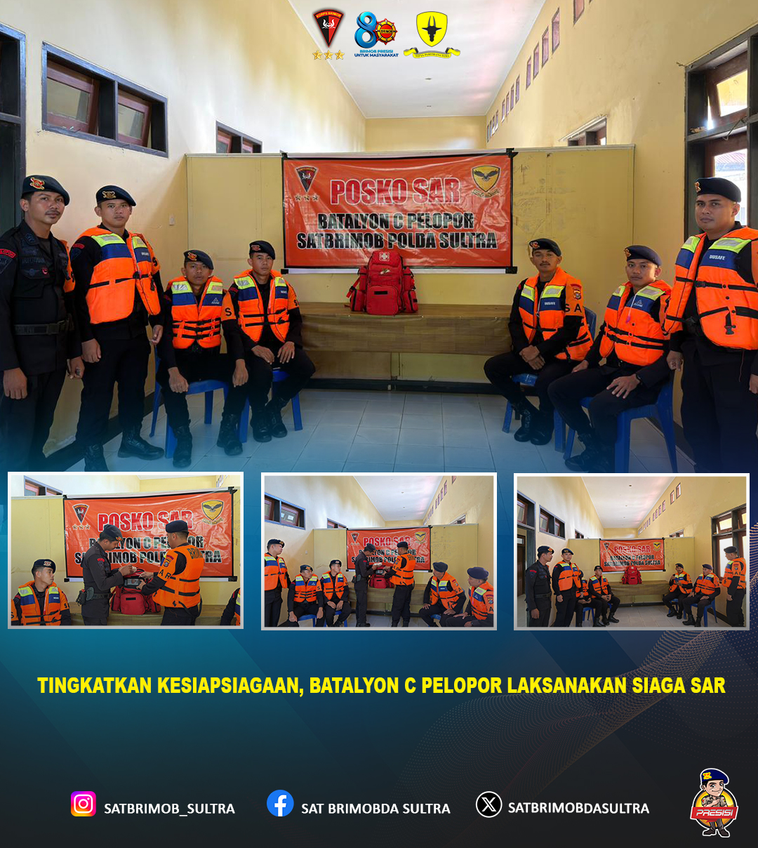 Personel Batalyon C Pelopor Satuan Brimob Polda Sulawesi Tenggara melaksanakan kegiatan Siaga SAR sebagai bentuk kesiapsiagaan dalam mengantisipasi potensi bencana maupun situasi darurat di wilayah tugasnya. Kegiatan tersebut dipimpin oleh Brigadir Rijal dengan penuh tanggung jawab dan semangat pengabdian.