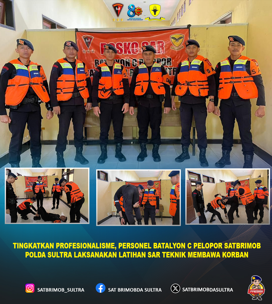 Dalam rangka meningkatkan kesiapsiagaan dan profesionalisme personel dalam menghadapi situasi darurat, Personel Batalyon C Pelopor Satuan Brimob Polda Sulawesi Tenggara melaksanakan kegiatan latihan Search and Rescue (SAR) dengan materi teknik membawa korban. Kegiatan tersebut dilaksanakan sebagai bagian dari program pembinaan kemampuan yang rutin digelar guna menunjang pelaksanaan tugas di lapangan.