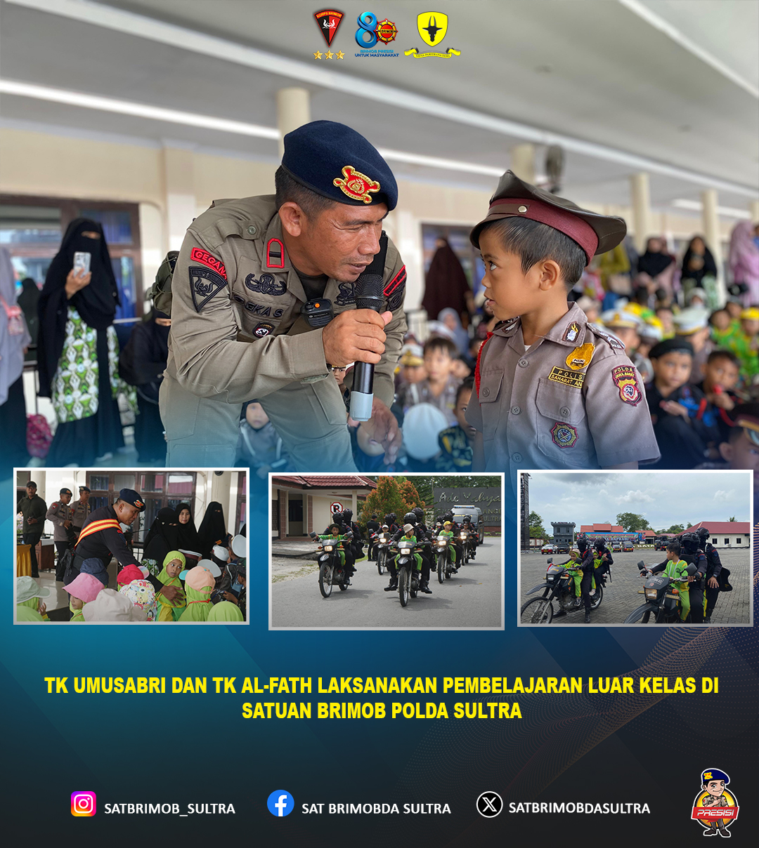 Satuan Brimob Polda Sulawesi Tenggara menerima kunjungan edukatif dari siswa dan guru TK Umusabri serta TK Al-Fath dalam rangka pelaksanaan pembelajaran luar kelas, yang berlangsung di Mako Satuan Brimob Polda Sultra, Kendari.