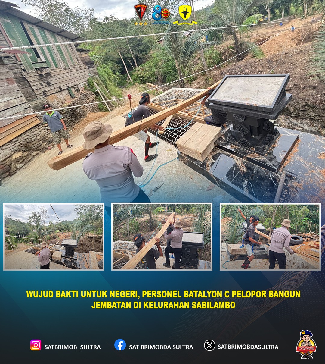 Kolaka — Personel Batalyon C Pelopor Satbrimob Polda Sultra melaksanakan kegiatan pembangunan jembatan di Kelurahan Sabilambo, Kecamatan Kolaka, Kabupaten Kolaka sebagai bentuk kepedulian dan pengabdian kepada masyarakat.