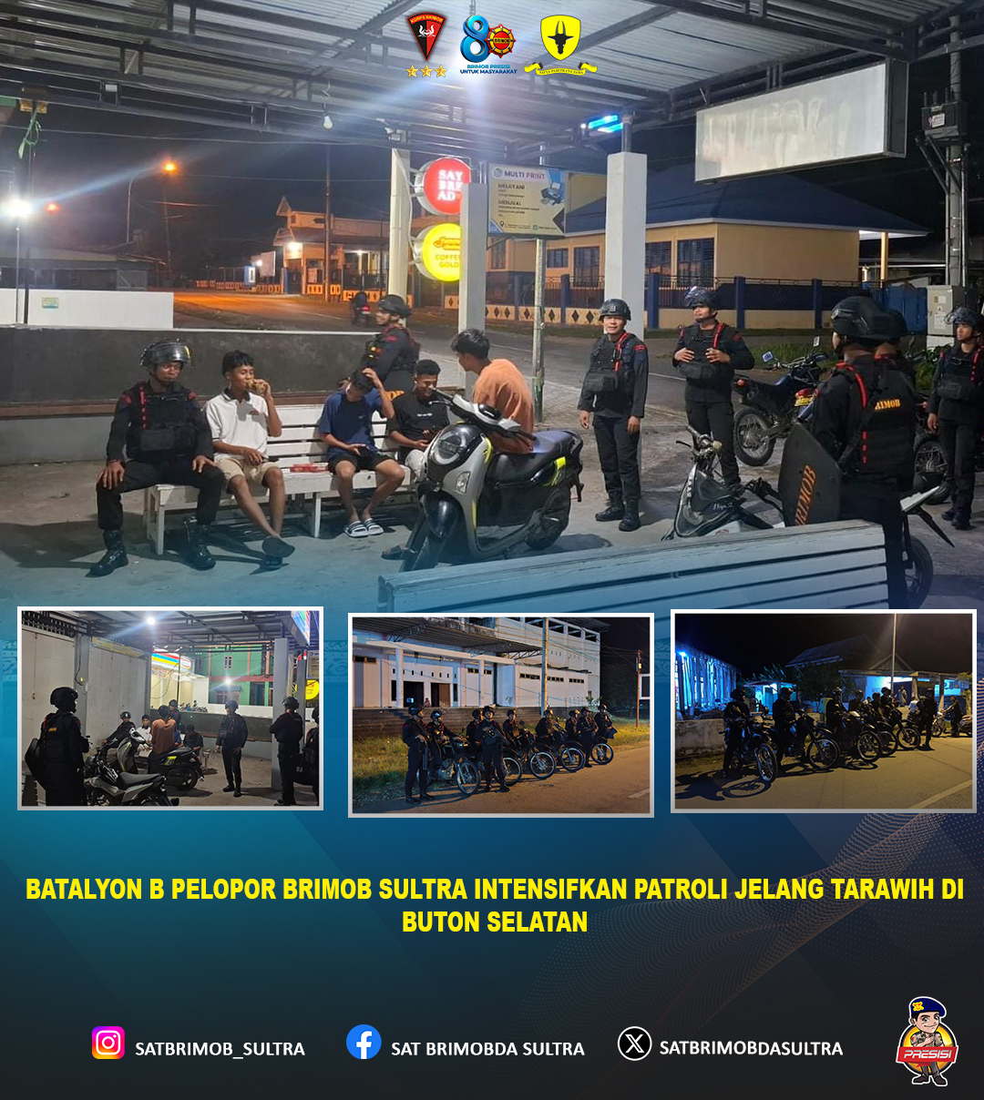 Batalyon B Pelopor Satuan Brimob Polda Sultra melaksanakan Patroli Kegiatan Rutin yang Ditingkatkan (KRYD) di wilayah Kelurahan Bosoa dan Kelurahan Burukena, Kecamatan Batauga, Kabupaten Buton Selatan, pada menjelang pelaksanaan salat tarawih.