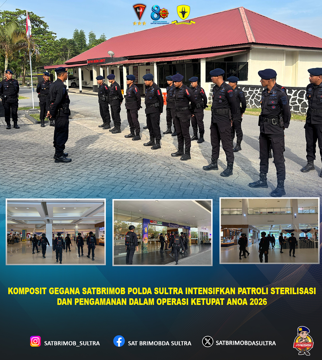 Kendari – Dalam rangka memastikan situasi keamanan dan ketertiban masyarakat tetap kondusif selama pelaksanaan Operasi Ketupat Anoa 2026, personel Komposit Gegana Satuan Brimob Polda Sulawesi Tenggara melaksanakan kegiatan patroli pengamanan dan sterilisasi di sejumlah titik strategis.