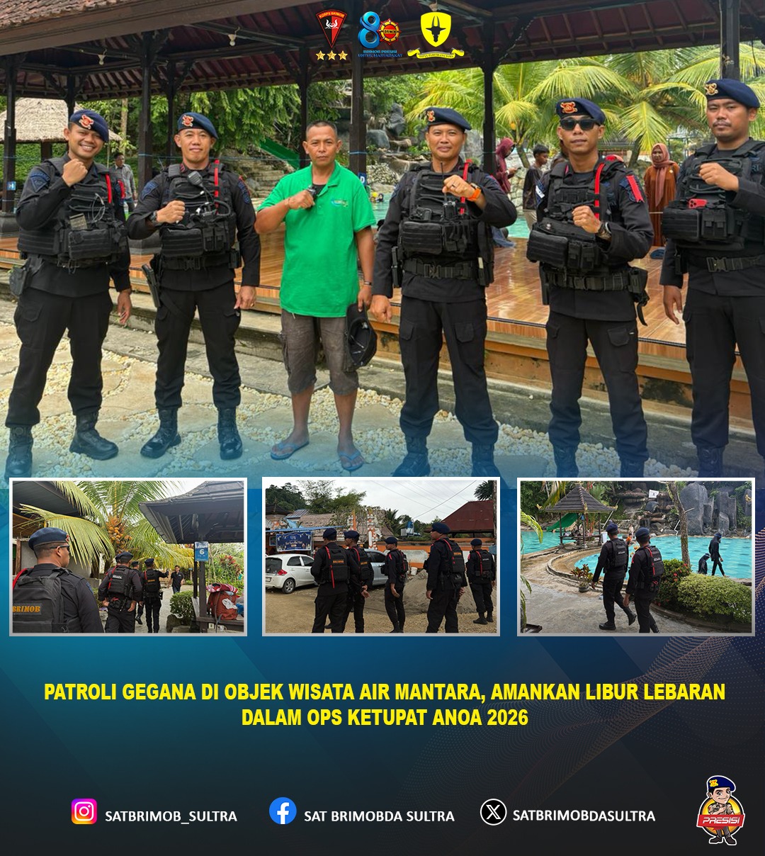 Dalam rangka mendukung pengamanan perayaan Hari Raya Idul Fitri, personel komposit Gegana Satuan Brimob Polda Sulawesi Tenggara melaksanakan patroli di kawasan Wisata Air Mantara. Kegiatan ini merupakan bagian dari pelaksanaan Operasi Ketupat Anoa 2026 guna memastikan situasi tetap aman dan kondusif selama meningkatnya aktivitas masyarakat di lokasi wisata.