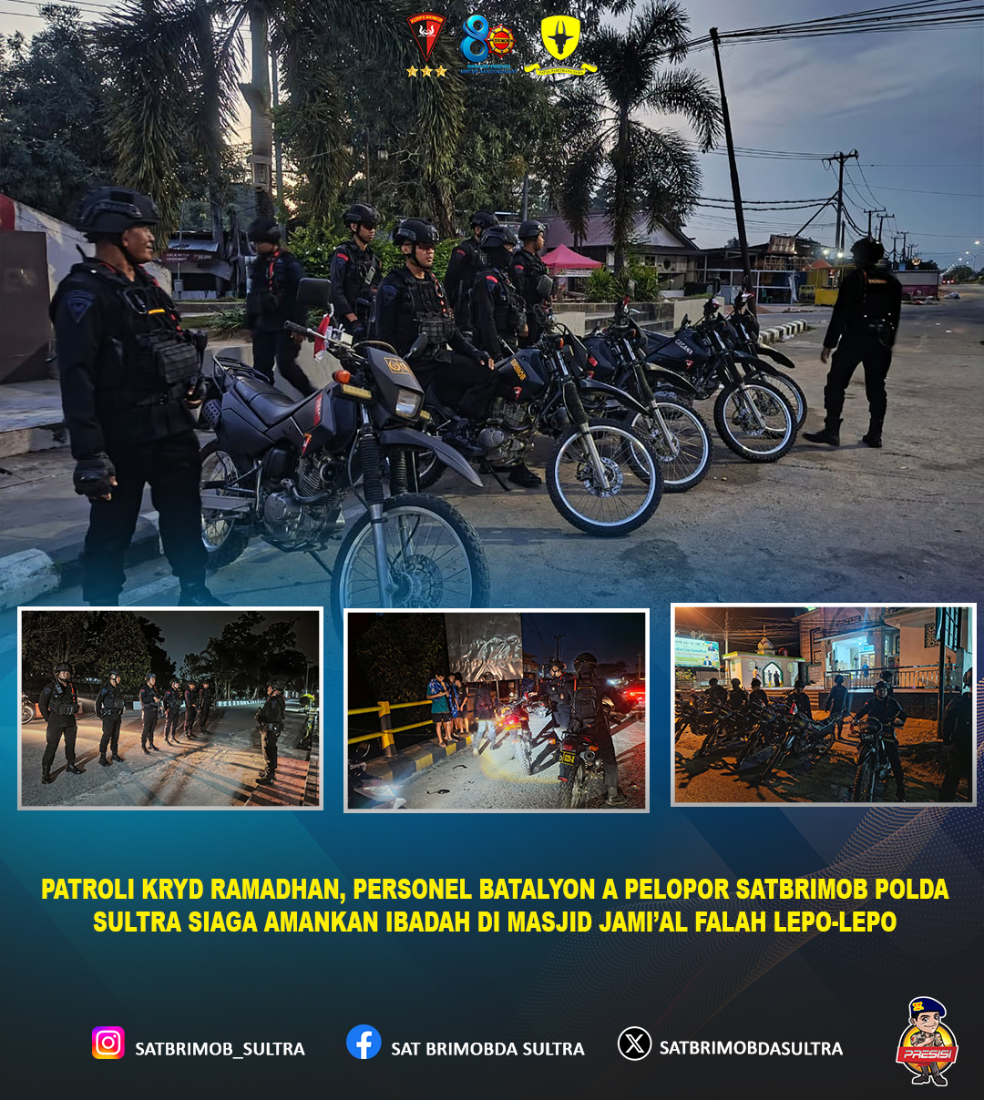 Dalam rangka menciptakan situasi kamtibmas yang aman dan kondusif selama bulan suci Ramadhan, Personel Batalyon A Pelopor Satuan Brimob Polda Sulawesi Tenggara (Sultra) melaksanakan kegiatan Patroli Kegiatan Rutin Yang Ditingkatkan (KRYD) yang dirangkaikan dengan standby pengamanan di depan Masjid Jami’al Falah, Kelurahan Lepo-Lepo.