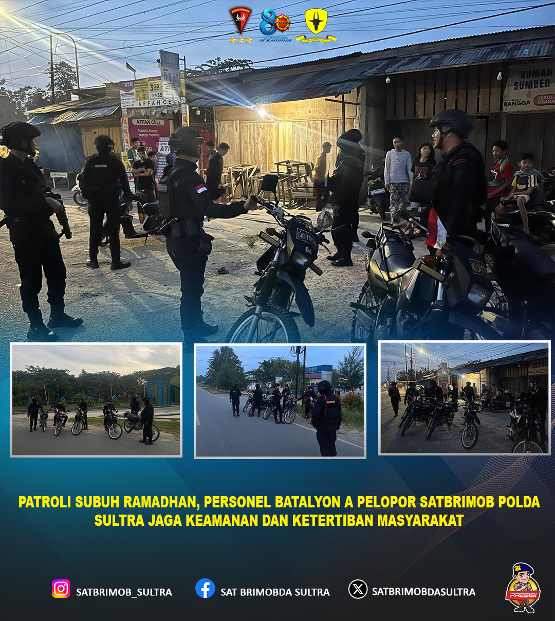 Dalam rangka menjaga situasi keamanan dan ketertiban masyarakat (Kamtibmas) selama bulan suci Ramadhan, Personel Batalyon A Pelopor Satuan Brimob Polda Sulawesi Tenggara melaksanakan kegiatan patroli subuh di sejumlah titik wilayah Kota Kendari.