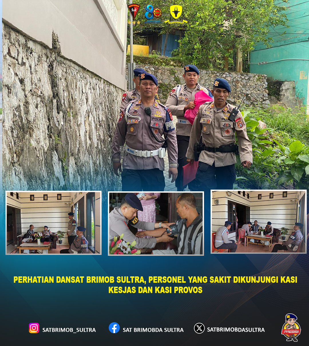 Kendari – Sebagai bentuk kepedulian terhadap kondisi personel, Komandan Satuan Brimob Polda Sulawesi Tenggara, Kombes Pol Agus Setiawan, S.I.K., melalui Kepala Seksi Kesehatan dan jasmani (Kasi Kesjas) AKP Makkatutu bersama Kepala Seksi Provos (Kasi Provos) AKP Mulyono melaksanakan kunjungan kepada salah satu personel Satbrimobda Sultra yang sedang mengalami sakit di wilayah Gunung Jati, Kecamatan Kendari Barat, Kota Kendari.
