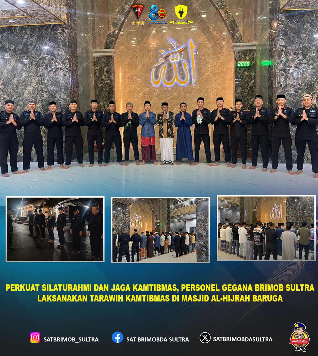 KENDARI – Dalam rangka menciptakan situasi keamanan dan ketertiban masyarakat (Kamtibmas) yang kondusif selama bulan suci Ramadhan, personel Detasemen Gegana Satuan Brimob Polda Sulawesi Tenggara melaksanakan kegiatan Tarawih Kamtibmas bersama masyarakat di Masjid Al-Hijrah, Kecamatan Baruga, Kota Kendari.