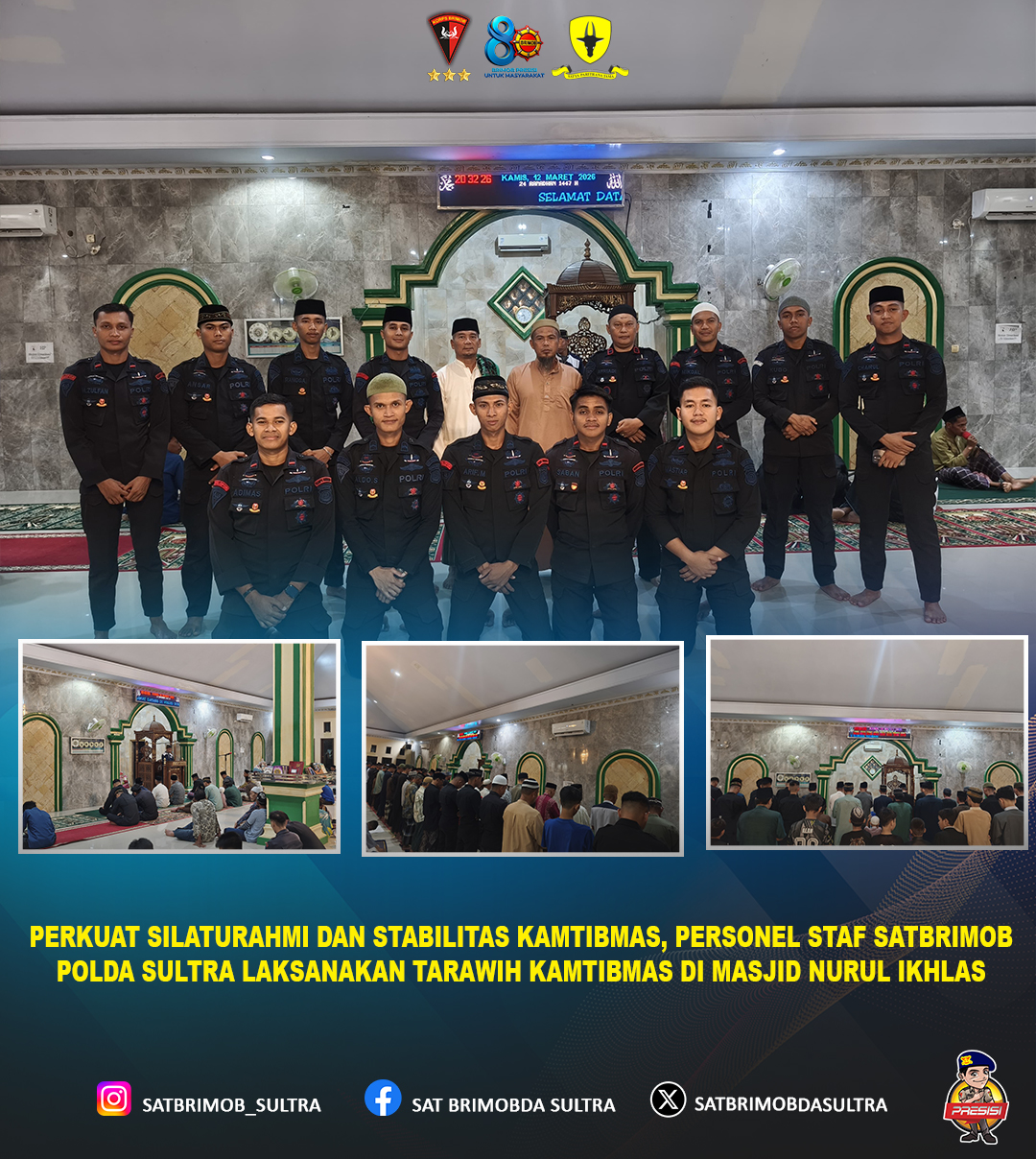 Dalam rangka mempererat hubungan antara Polri dan masyarakat sekaligus menjaga situasi keamanan dan ketertiban masyarakat (kamtibmas) selama bulan suci Ramadan, personel staf satuan Satuan Brimob Polda Sulawesi Tenggara melaksanakan kegiatan Tarawih Kamtibmas bersama masyarakat di Masjid Nurul Ikhlas.