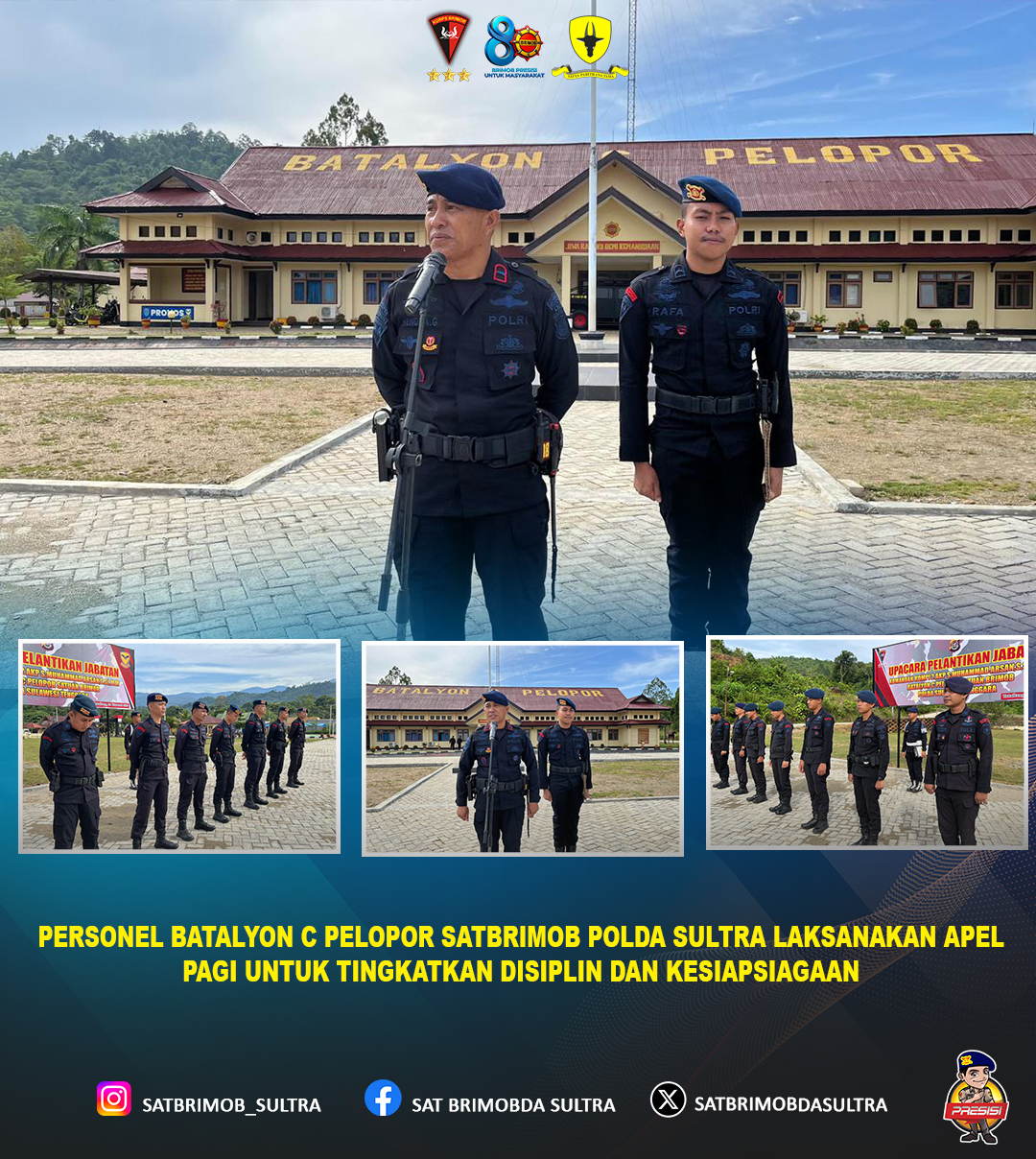 Dalam rangka meningkatkan kedisiplinan, kesiapsiagaan serta soliditas personel, Personel Batalyon C Pelopor Satuan Brimob Polda Sulawesi Tenggara melaksanakan kegiatan apel pagi yang berlangsung di halaman Markas Komando Batalyon C Pelopor. Kegiatan apel pagi tersebut diikuti oleh seluruh personel dengan penuh khidmat dan tanggung jawab sebagai bagian dari rutinitas kedinasan.