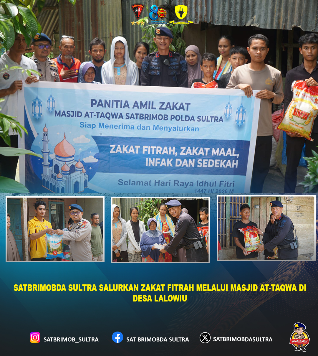 Konawe Selatan – Dalam rangka menyambut Hari Raya Idulfitri 1447 H, Masjid At-Taqwa Satbrimobda Sultra melaksanakan kegiatan pendistribusian zakat fitrah kepada masyarakat yang berhak menerima di Desa Lalowiu, Kabupaten Konawe Selatan. Kegiatan ini merupakan wujud kepedulian sosial sekaligus bentuk pengabdian kepada masyarakat oleh jajaran Satuan Brimob Polda Sulawesi Tenggara.