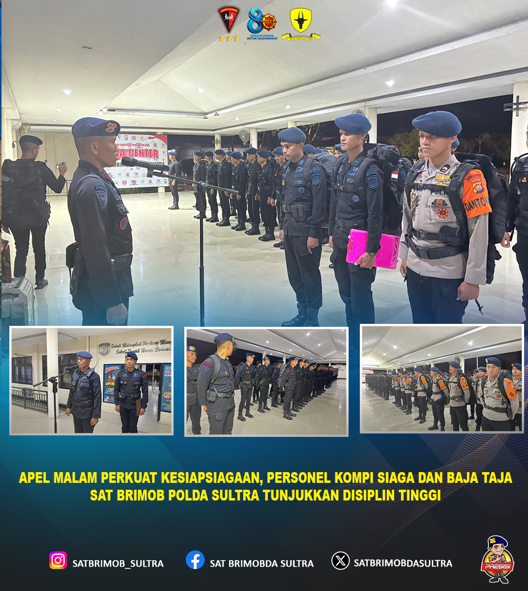 Dalam rangka menjaga dan meningkatkan kesiapsiagaan serta disiplin personel, Personel Kompi Siaga bersama seluruh jajaran Baja Taja Satuan Brimob Polda Sulawesi Tenggara melaksanakan kegiatan Apel Malam yang berlangsung dengan tertib dan penuh khidmat.