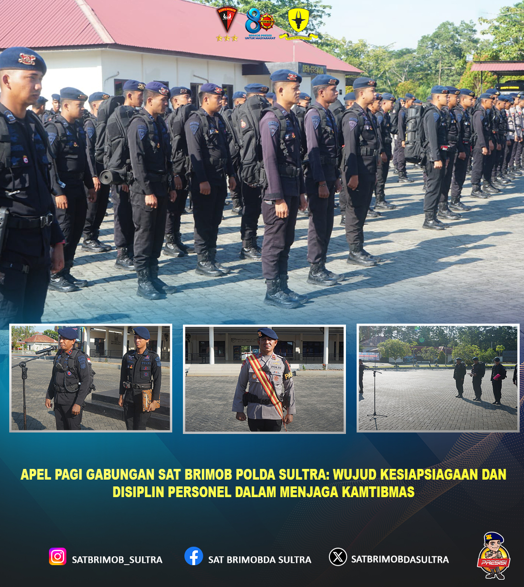 Personel Kompi Siaga, Komposit Gegana, serta seluruh jajaran Bintara dan Tamtama (Baja Taja) Satuan Brimob Polda Sulawesi Tenggara melaksanakan kegiatan apel pagi sebagai bentuk kesiapsiagaan dan konsolidasi internal dalam menghadapi berbagai potensi gangguan keamanan dan ketertiban masyarakat (kamtibmas).
