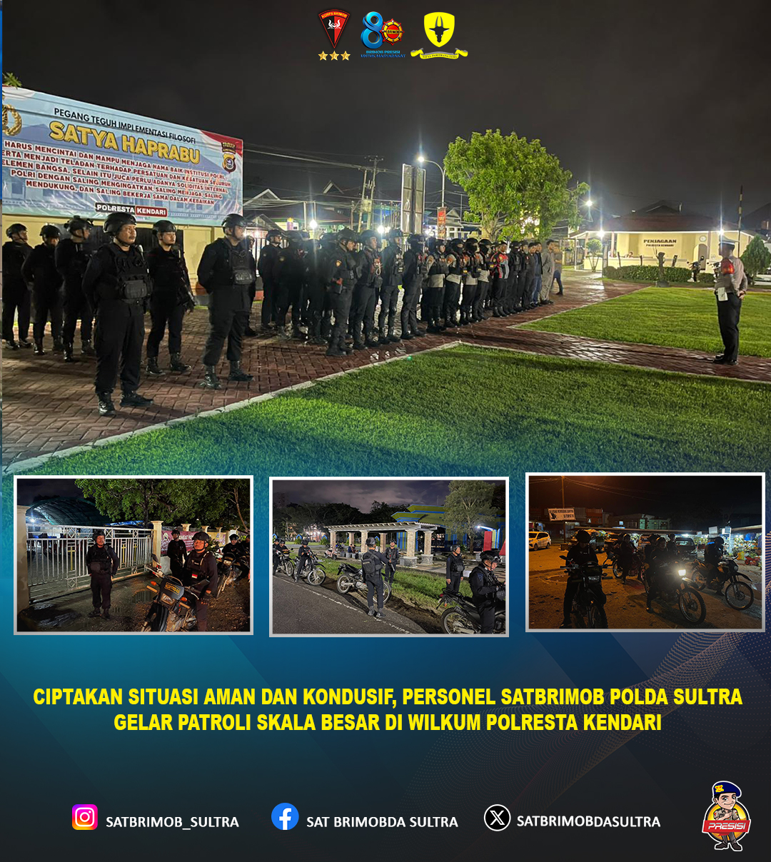 Kendari – Dalam rangka menjaga stabilitas keamanan dan ketertiban masyarakat, personel Satuan Brimob Polda Sulawesi Tenggara melaksanakan kegiatan patroli skala besar di wilayah hukum Polresta Kendari. Kegiatan ini dilakukan sebagai bentuk komitmen Polri dalam menciptakan situasi yang aman, tertib, dan kondusif di tengah masyarakat.