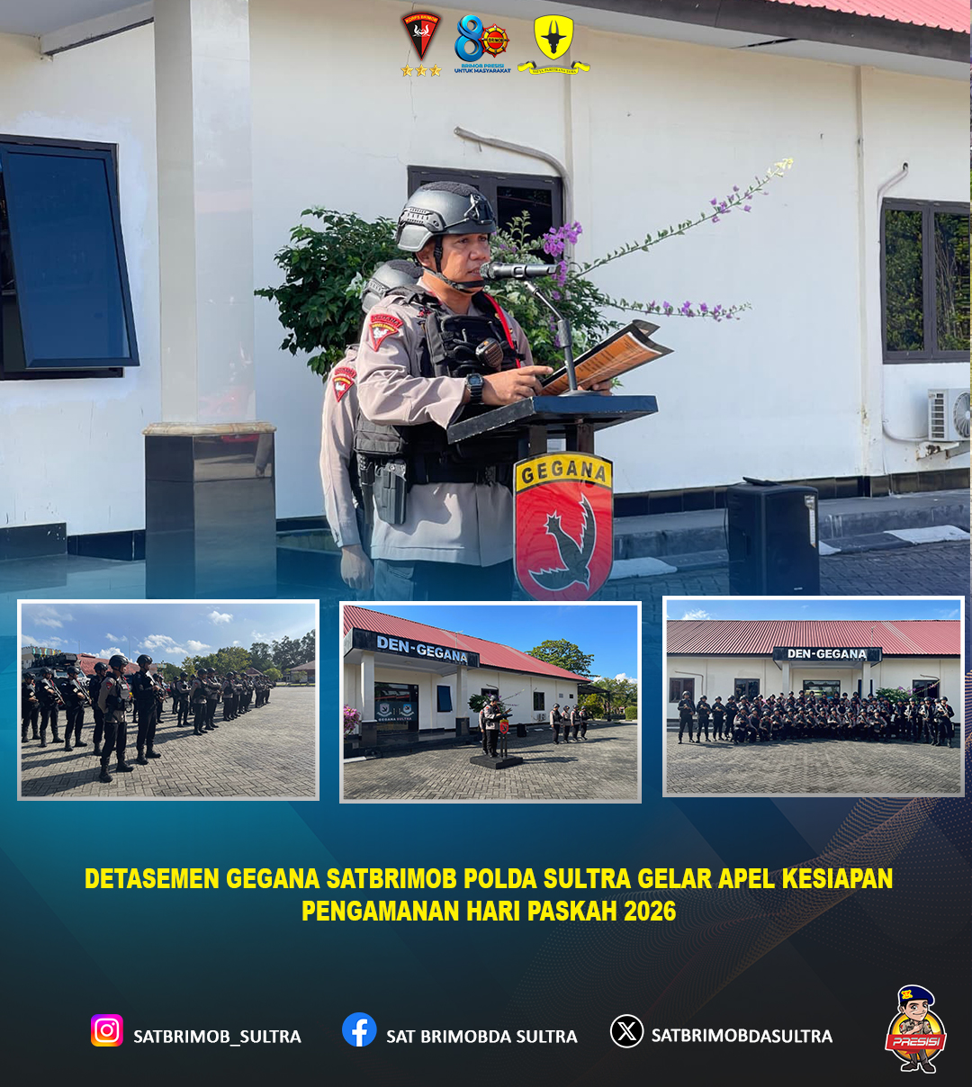 Kendari — Dalam rangka menjamin keamanan dan kelancaran perayaan Hari Paskah tahun 2026, personel Detasemen Gegana Satuan Brimob Polda Sulawesi Tenggara melaksanakan kegiatan Apel Kesiapan Pengamanan yang dipimpin langsung oleh Danden Gegana Satbrimob Polda Sultra, Kompol Asri Diyni, S.E., M.M.