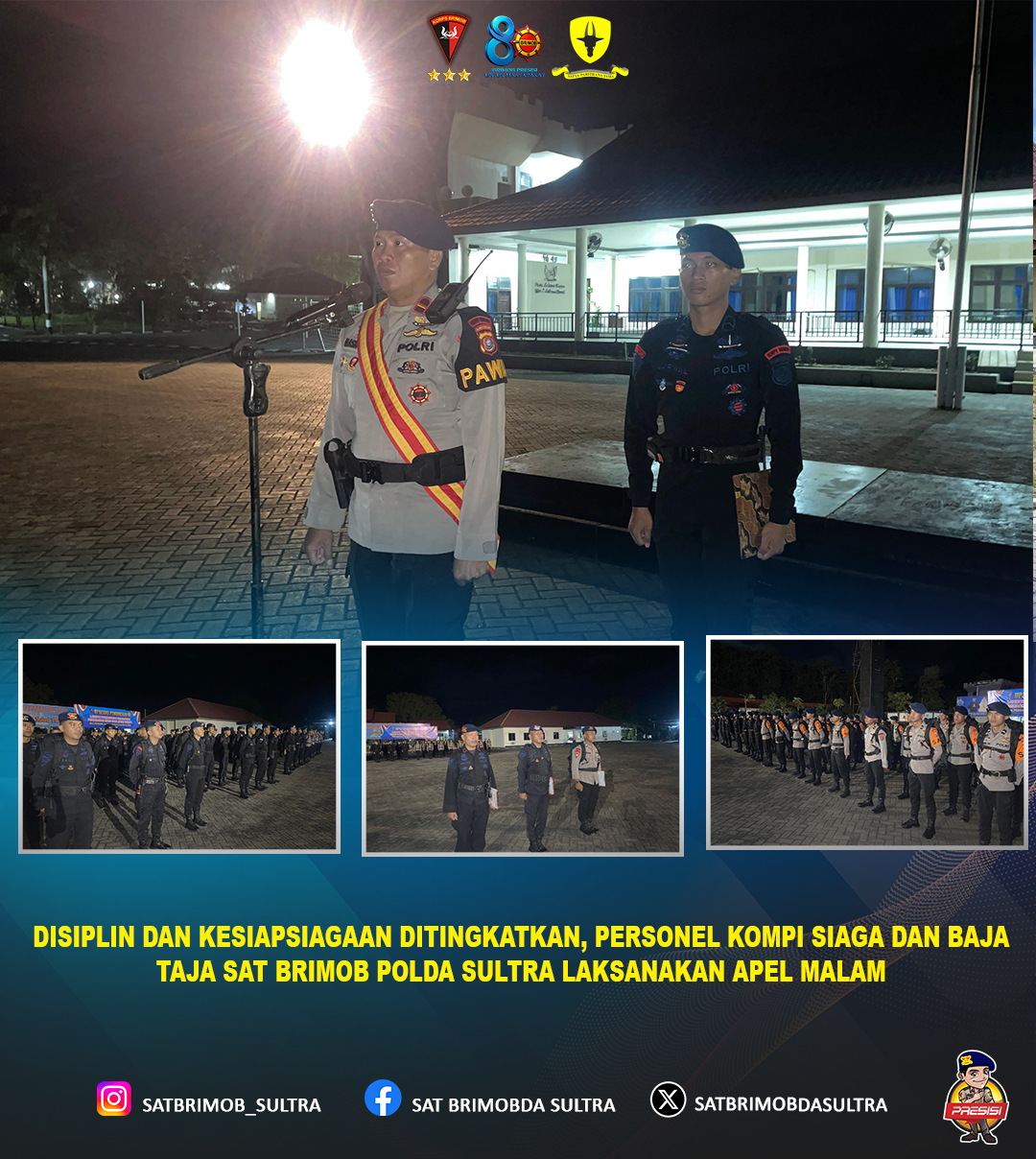 Apel malam tersebut dilaksanakan di lingkungan Mako Sat Brimob Polda Sultra dengan penuh khidmat dan disiplin tinggi. Kegiatan ini diikuti oleh seluruh personel Kompi Siaga dan Baja Taja sebagai bentuk konsolidasi kekuatan serta pengecekan kesiapan personel maupun perlengkapan dalam menghadapi berbagai potensi gangguan keamanan dan ketertiban masyarakat.