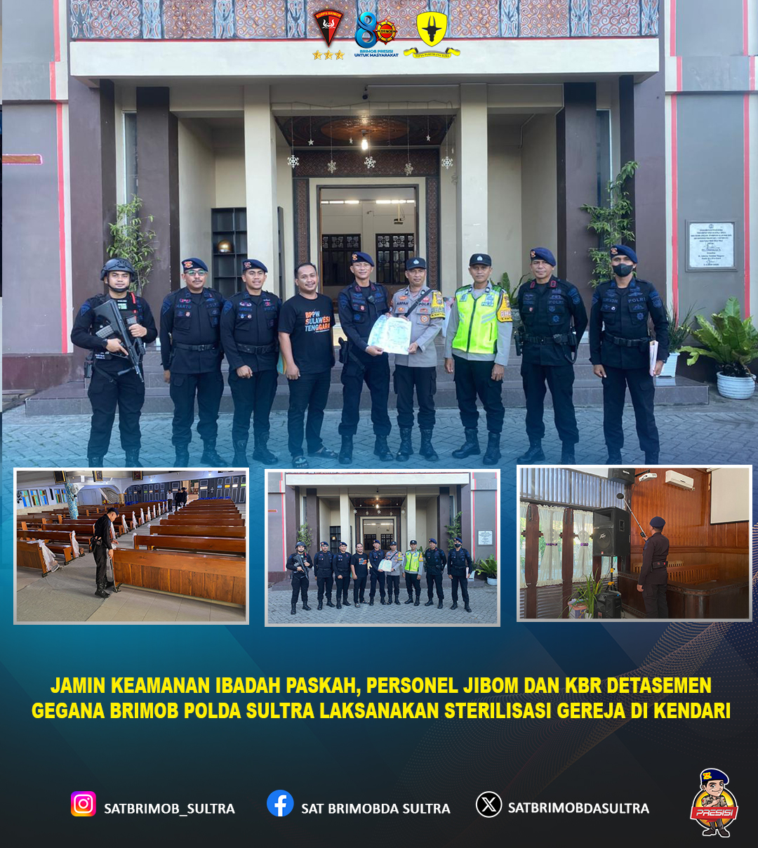 Kendari – Dalam rangka memberikan rasa aman dan nyaman bagi umat Kristiani yang melaksanakan ibadah dalam menyambut peringatan Hari Paskah, personel Jibom (Penjinak Bom) dan KBR (Kimia, Biologi, Radioaktif) Detasemen Gegana Satuan Brimob Polda Sulawesi Tenggara melaksanakan kegiatan sterilisasi di sejumlah gereja yang tersebar di wilayah Kota Kendari.