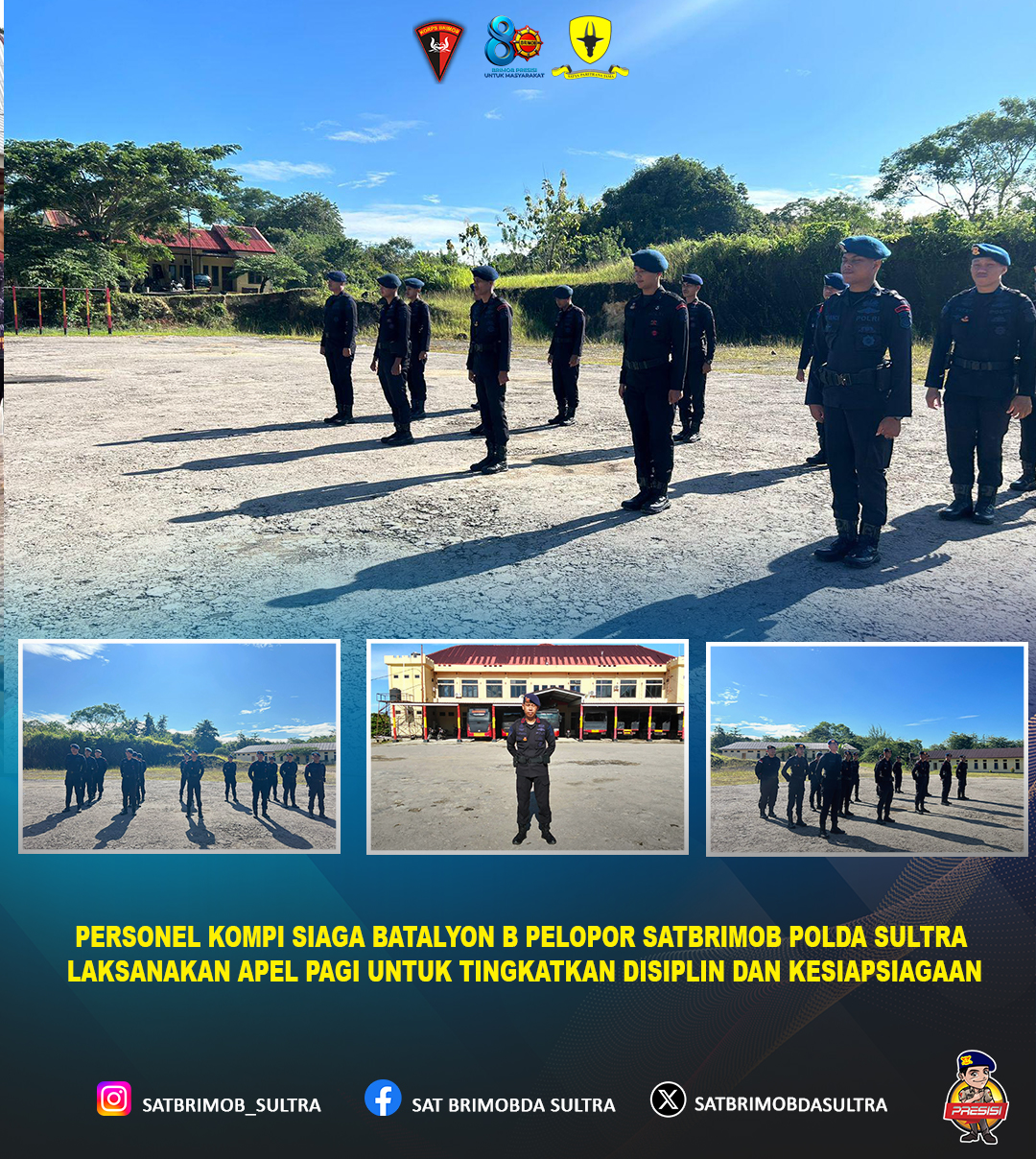 Personel Kompi Siaga Batalyon B Pelopor Satuan Brimob Polda Sulawesi Tenggara melaksanakan kegiatan apel pagi sebagai bentuk pembinaan disiplin serta kesiapan dalam menjalankan tugas kepolisian, pada hari ini di lingkungan markas komando setempat.