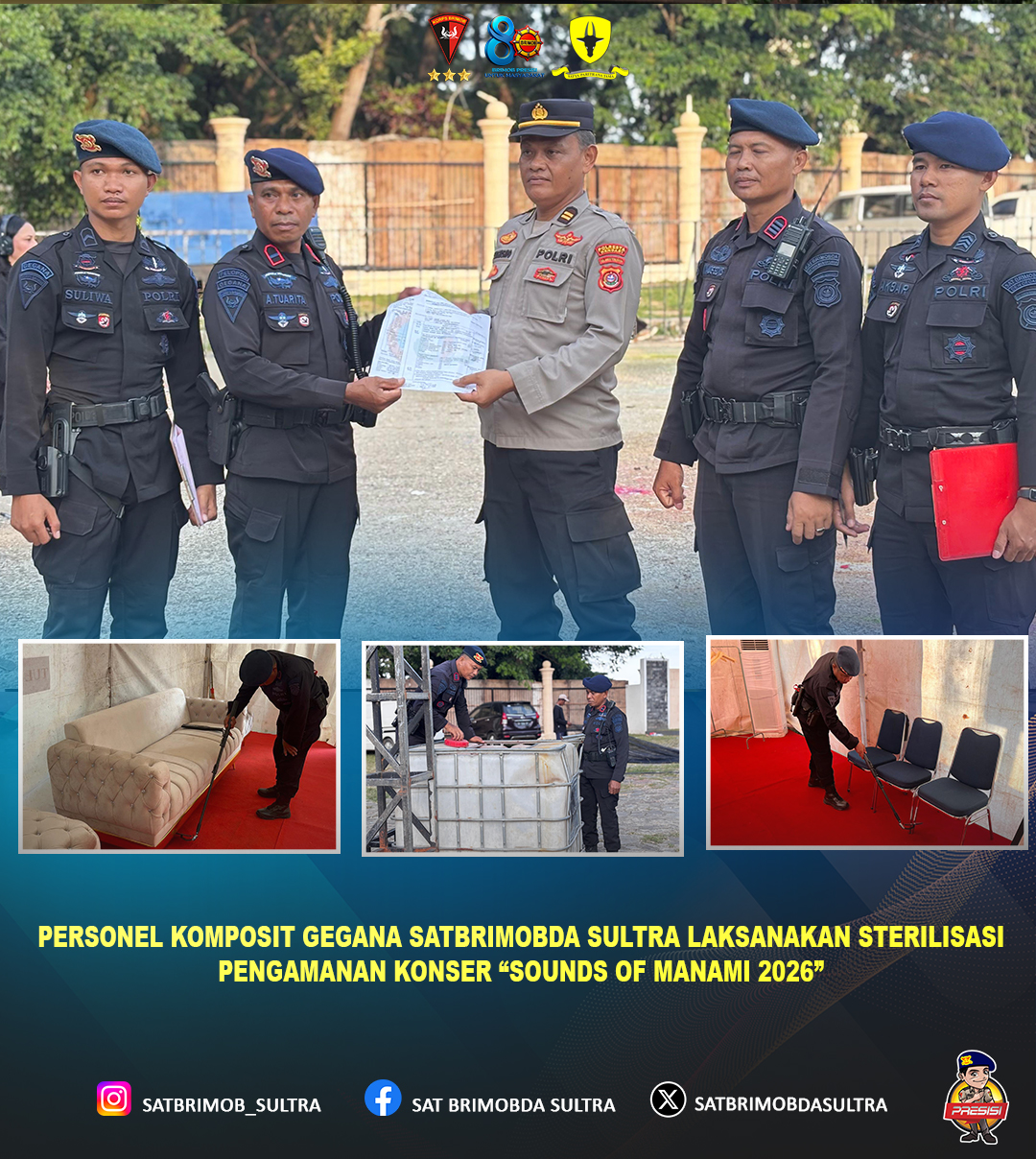Kendari — Dalam rangka menjamin keamanan dan kelancaran pelaksanaan konser musik bertajuk “Sounds of Manami Tahun 2026”, Personel Komposit Gegana Satuan Brimob Polda Sulawesi Tenggara melaksanakan kegiatan sterilisasi di lokasi acara, sebelum kegiatan berlangsung.