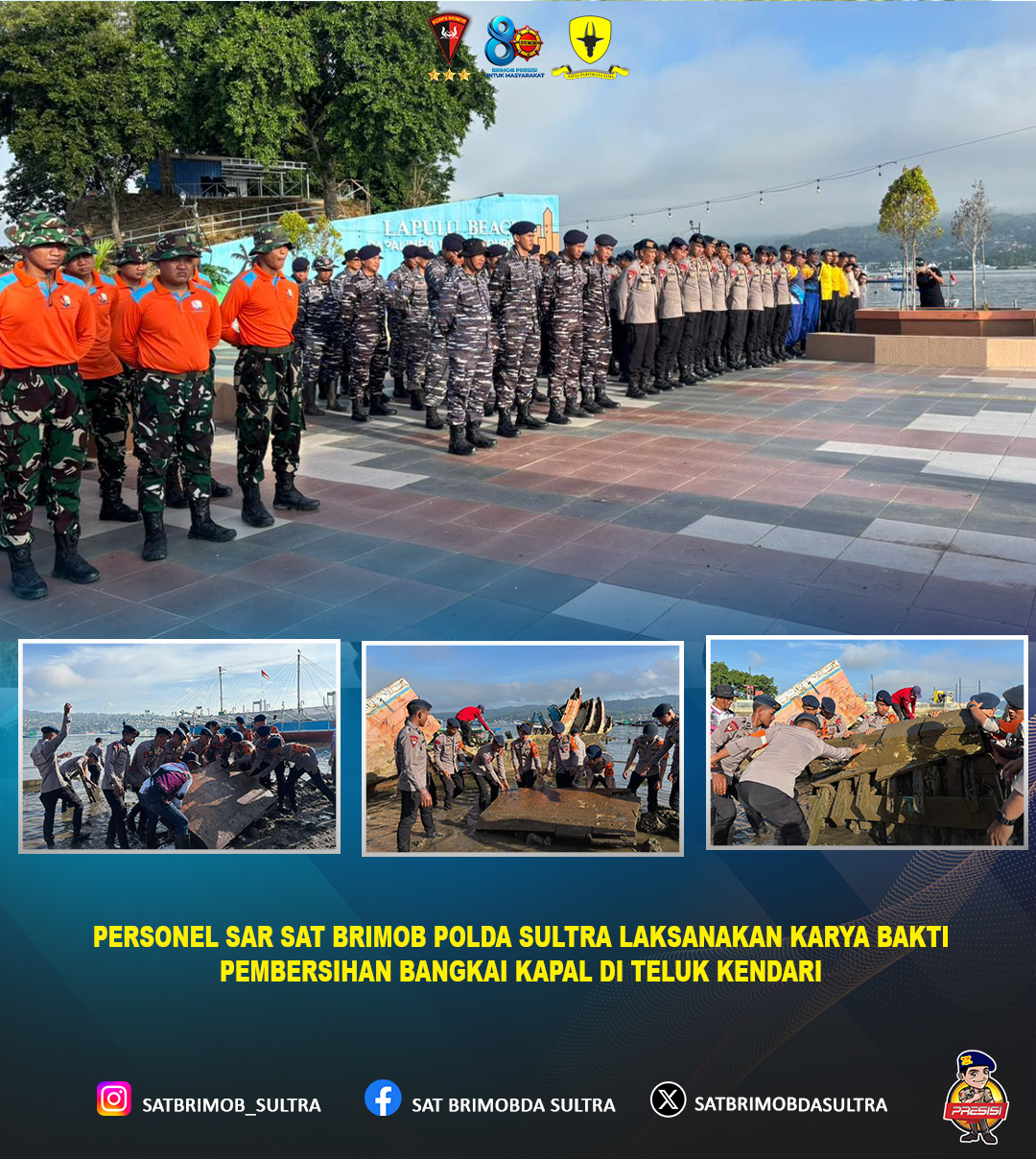 Kendari – Dalam rangka meningkatkan kepedulian terhadap kebersihan lingkungan sekaligus menjaga keselamatan aktivitas pelayaran, Personel SAR Satuan Brimob Polda Sulawesi Tenggara melaksanakan kegiatan karya bakti berupa pembersihan bangkai kapal di kawasan Teluk Kendari.
